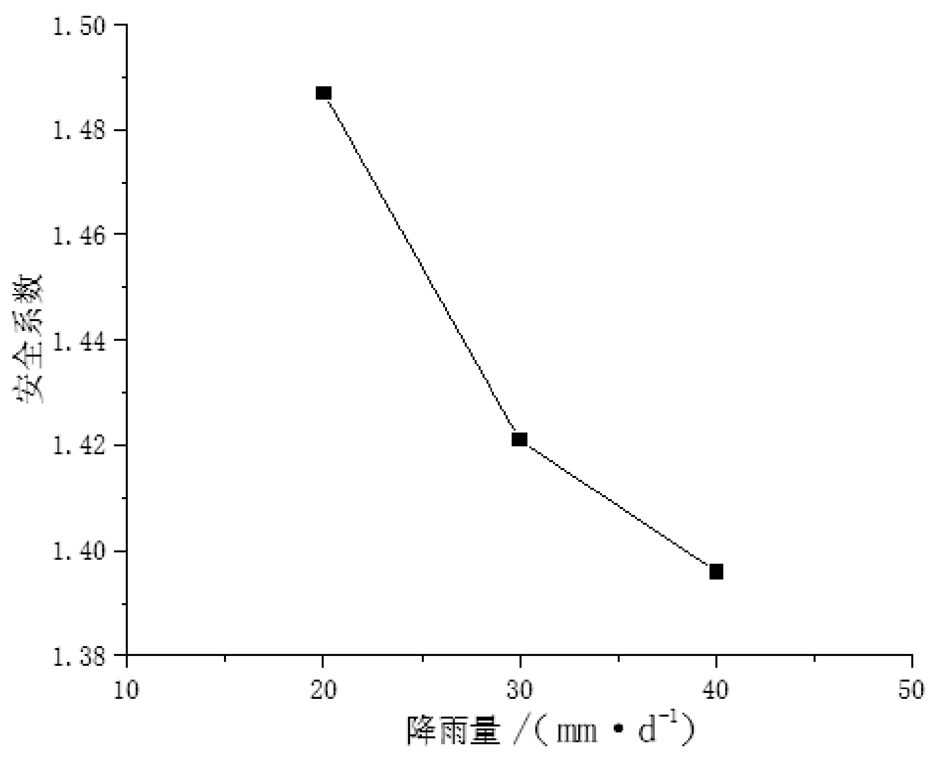 (2)安全系数随降雨量增大而减小,降雨量达到一定程度之后,岩土体充水接近饱和,边坡易发生破坏。