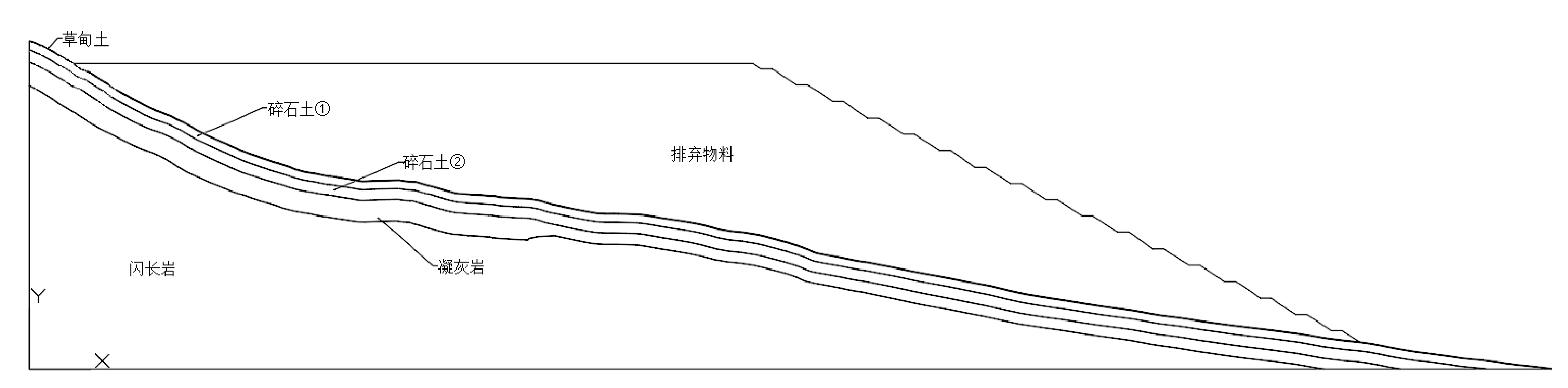 排土场设计终了边坡计算剖面线垂直台阶线,选取最高最陡且具有代表性的剖面(图1)进行计算。
