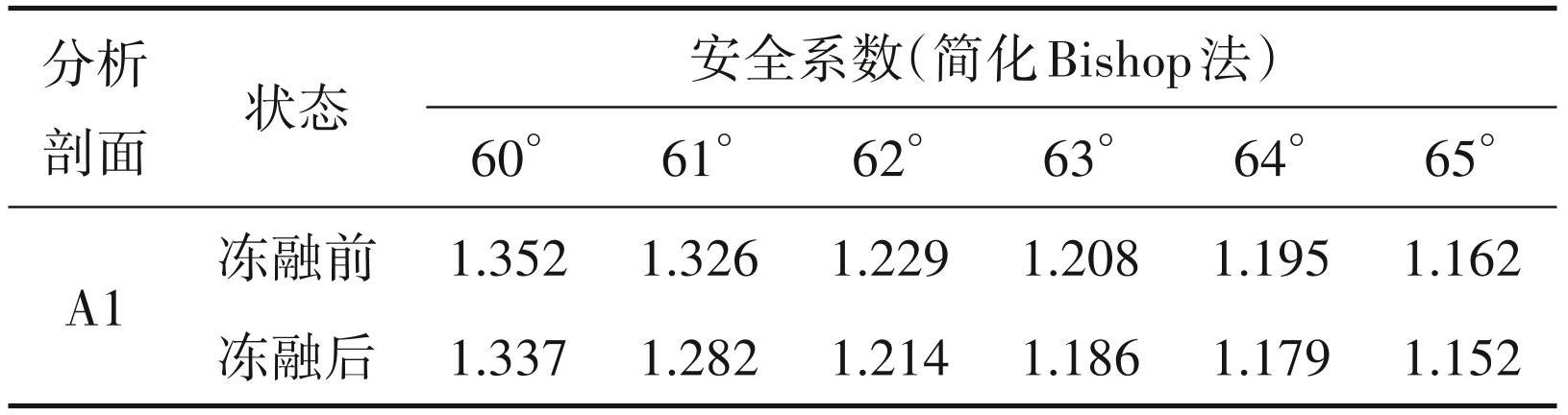 以A1剖面为研究对象,逐次按1°提高剖面最终边坡角,各剖面最终边坡角依次为 60°、61°、62°、 63°、64°、65°,基于极限平衡法,分别计算冻融前及冻融后安全系数,安全系数汇总于表4,计算结果如图3所示。