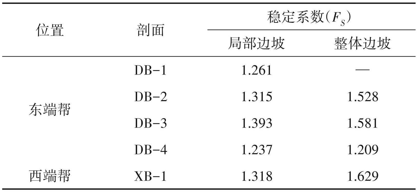 根据表2 边坡稳定计算统计结果可知:采场东端帮局部边坡稳定系数为 1.237~1.393,均满足安全储备系数 1.15 的要求,整体边坡稳定系数为1.20 9~1.581,均满足安全储备系数1.2的要求;采场西端帮局部边坡稳定系数为 1.318,满足安全储备系数1.15的要求,整体边坡稳定系数为1.629,满足安全储备系数 1.2 的要求。因此,目前采场边坡处于稳定状态。