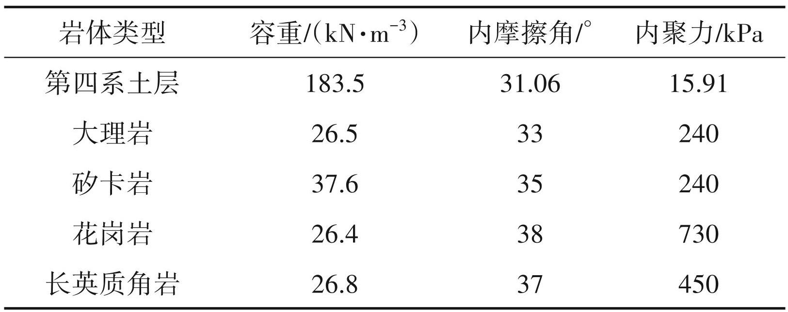 Ⅱ区位于采场的西北部,3515 m标高以上均已到界,最大边坡高度约98 m,边坡角 44°~48°;年度计划最大降深 20 m,边坡控制角 46°。组成该区边坡的岩层有:第四系土体、强风化层、大理岩、矽卡岩(矿体)、长英质角岩、结晶灰岩及花岗岩。该区地下静水位埋设约 39 m,矿化作用较低,各岩层完整性好,力学强度较高,2-1剖面位置如图1所示,具体模型如图2 所示,边坡岩土体参数取值如表4 所示。
