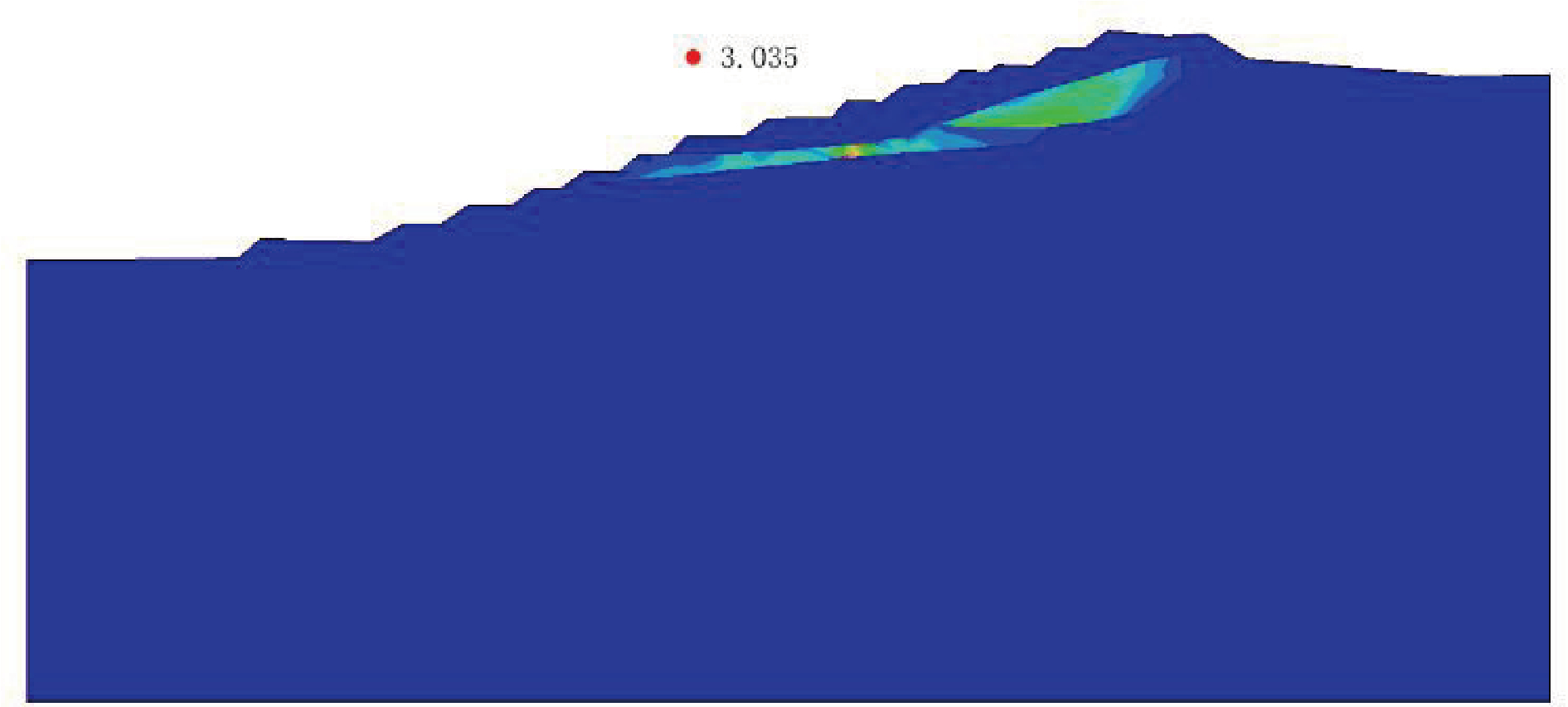 东北区代表性剖面如图9 所示,剖面高度 192.4 m,边坡角度 15°,上部存在一定厚度中风化岩层和碎裂状二长花岗岩,碎裂状、块状二长花岗岩是一种常见的火成岩,岩石中存在着大量的碎裂、裂缝和断裂,具有特定的岩石特性,包括颗粒状的结构、明显的二长矿物晶粒等。这些特性影响着岩石的力学性质、工程特性以及在地质环境中的稳定性,且对边坡局部的稳定性影响较大。如图10~图12所示,剖面计算结果如下: