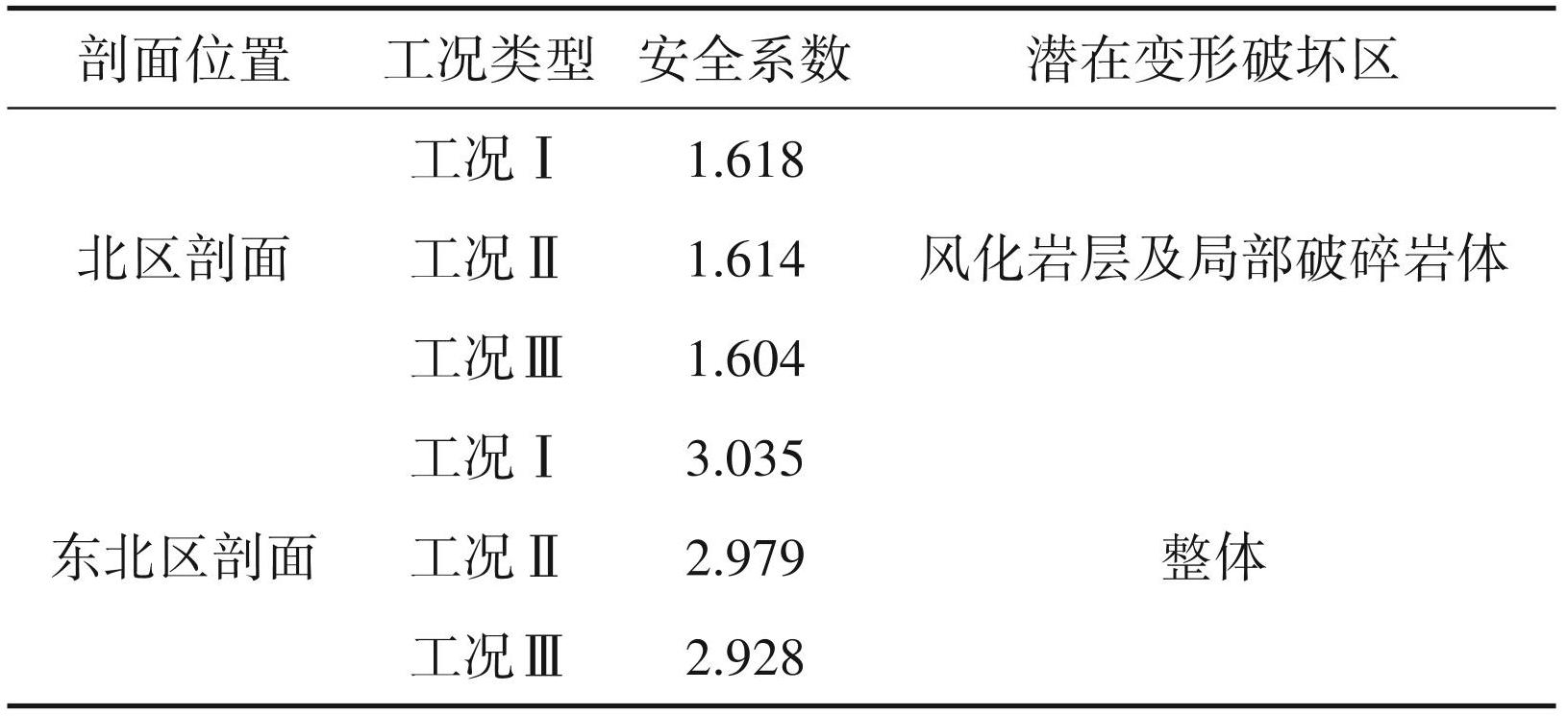 数值模拟结果显示,北区剖面在工况Ⅰ、Ⅱ、Ⅲ 下得出的安全系数模拟结果分别为 1.618、1.614、 1.604,均处于稳定状态。工况Ⅱ转变为工况Ⅲ时,位移区分布位置不变,范围增大。塑性应变区及滑移带范围扩大,但仍集中于中风化二长花岗岩内,边坡滑坡风险增加,破坏形式不发生变化。东北区剖面在工况Ⅰ、Ⅱ、Ⅲ下得出的安全系数模拟结果分别为3. 035、2.979、2.928,均处于稳定状态。3种工况下塑性应变区及滑移带范围不变,均集中于碎裂状二长花岗岩内。
