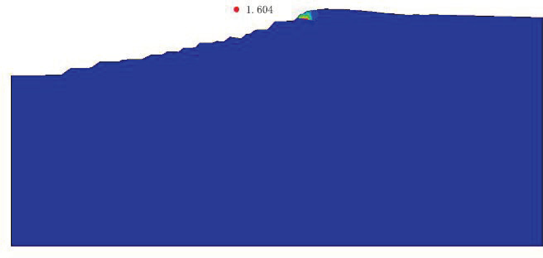 参数 φr 和 cr 为折减后的强度指标,将 φr 和 cr 带入有限元计算,如果折减系数 Fr >1. 0,则利用有限元计算的位移和应力就比实际的大,破坏的单元也比实际的多。令 Fr从 1. 0 逐步增大,则计算的位移逐步变大,破坏单元逐步增加,当边坡整体失稳时的 Fr即为安全系数,此时的 Fr 也符合 Bishop 法的定义。