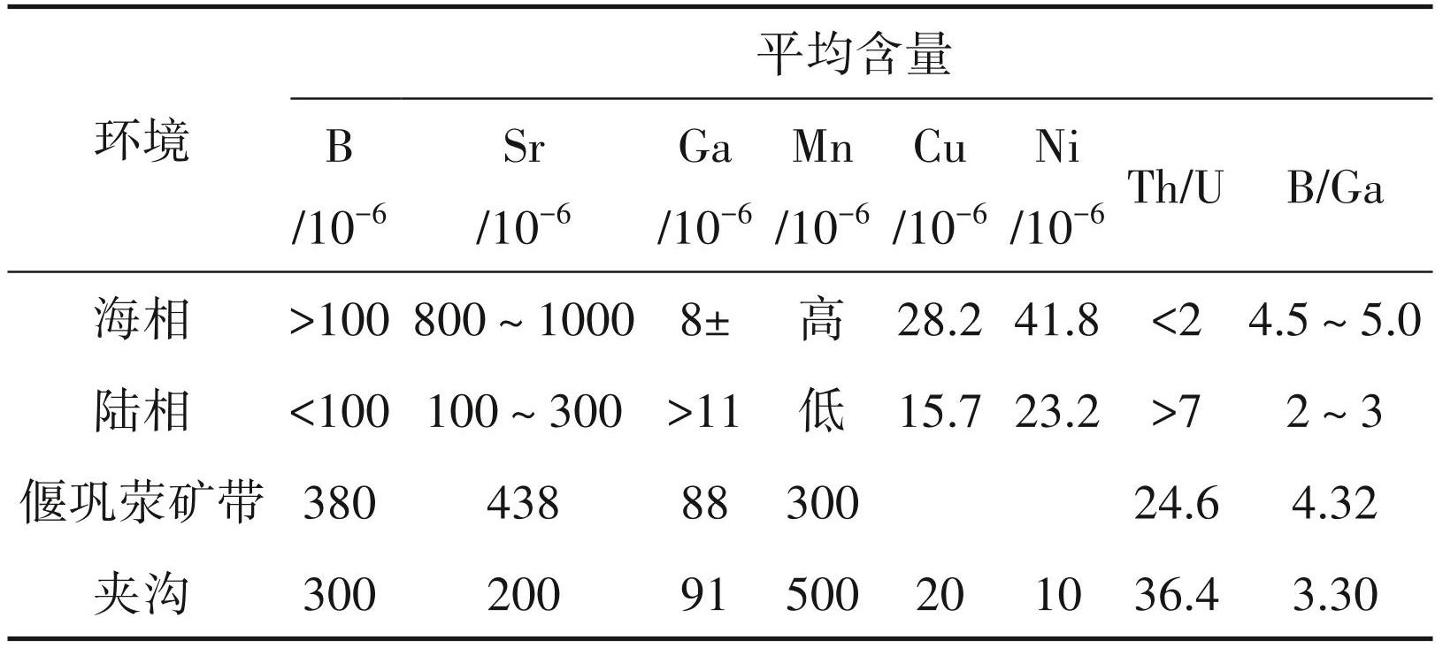 硼是区别海相和陆相沉积物的最可靠的指相元素。沉积物中硼的含量与水体中硼的含量有关,水体中的硼来自陆源碎屑中的电气石(李国平和张瑜麟,2013)。据表1 可知,夹沟矿区和偃巩荥矿带的指相结果是一致的。除硼和锰示为海相外,锶、镓、镍和钍铀比则表示为陆相,而铜和硼镓比则示为海陆相。