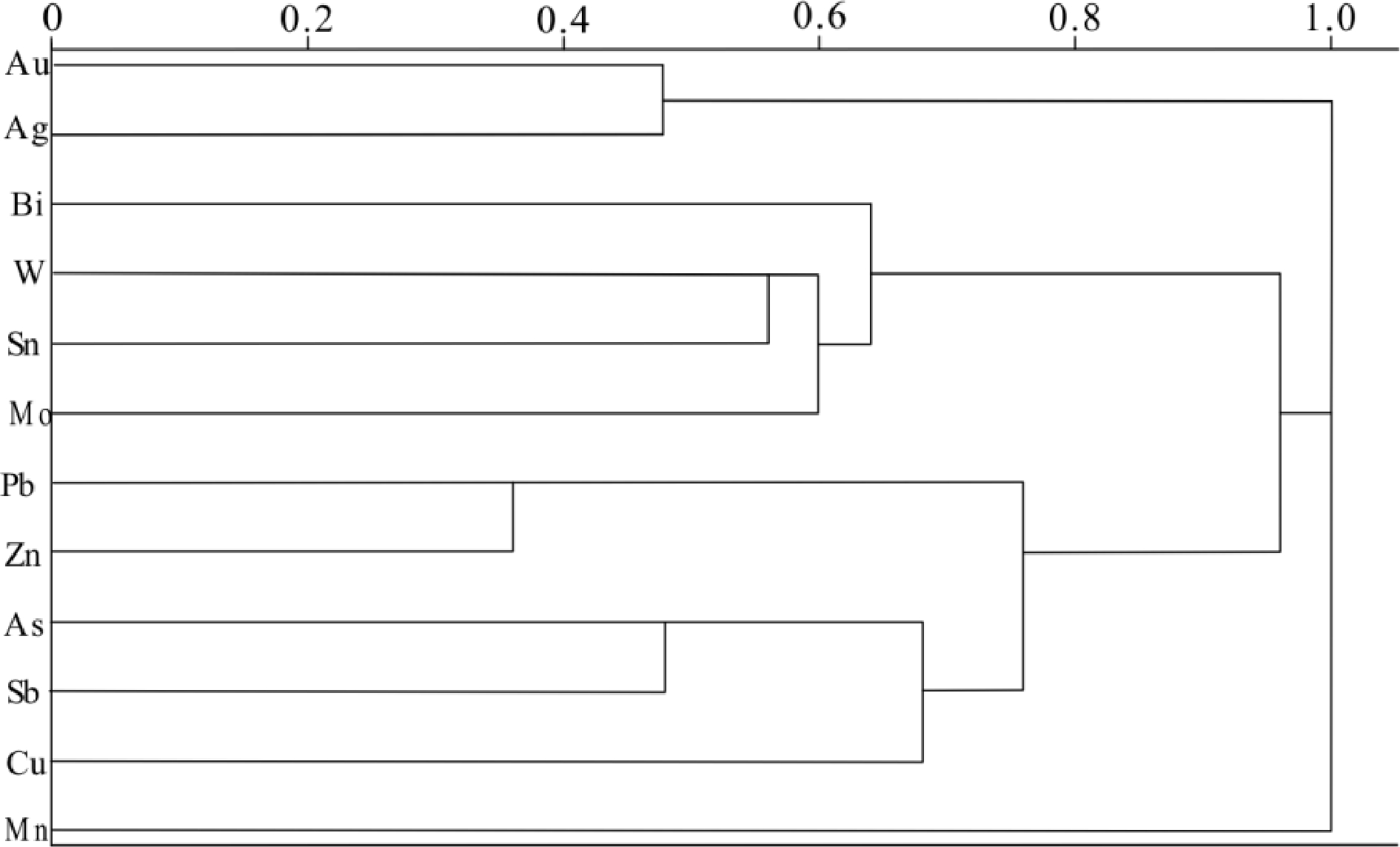 R 型聚类分析图中将相关系数置于 0.38 水平上,矿区内各元素大致分为3组:第一组为Ag-Au组合,为一套典型的中低温热液元素组合,一般与构造或岩浆活动有关;第二组为W-Mo-Sn-Bi组合,其中W与Sn关系较为密切,为一组中高温热液元素组合,应该与五丈山岩体有关;第三组为 Cu-Pb-Zn-As-Sb 组合,主要为一中低温热液元素组合,其中 Pb、Zn 关系较为密切,可能与构造或岩浆活动有关。