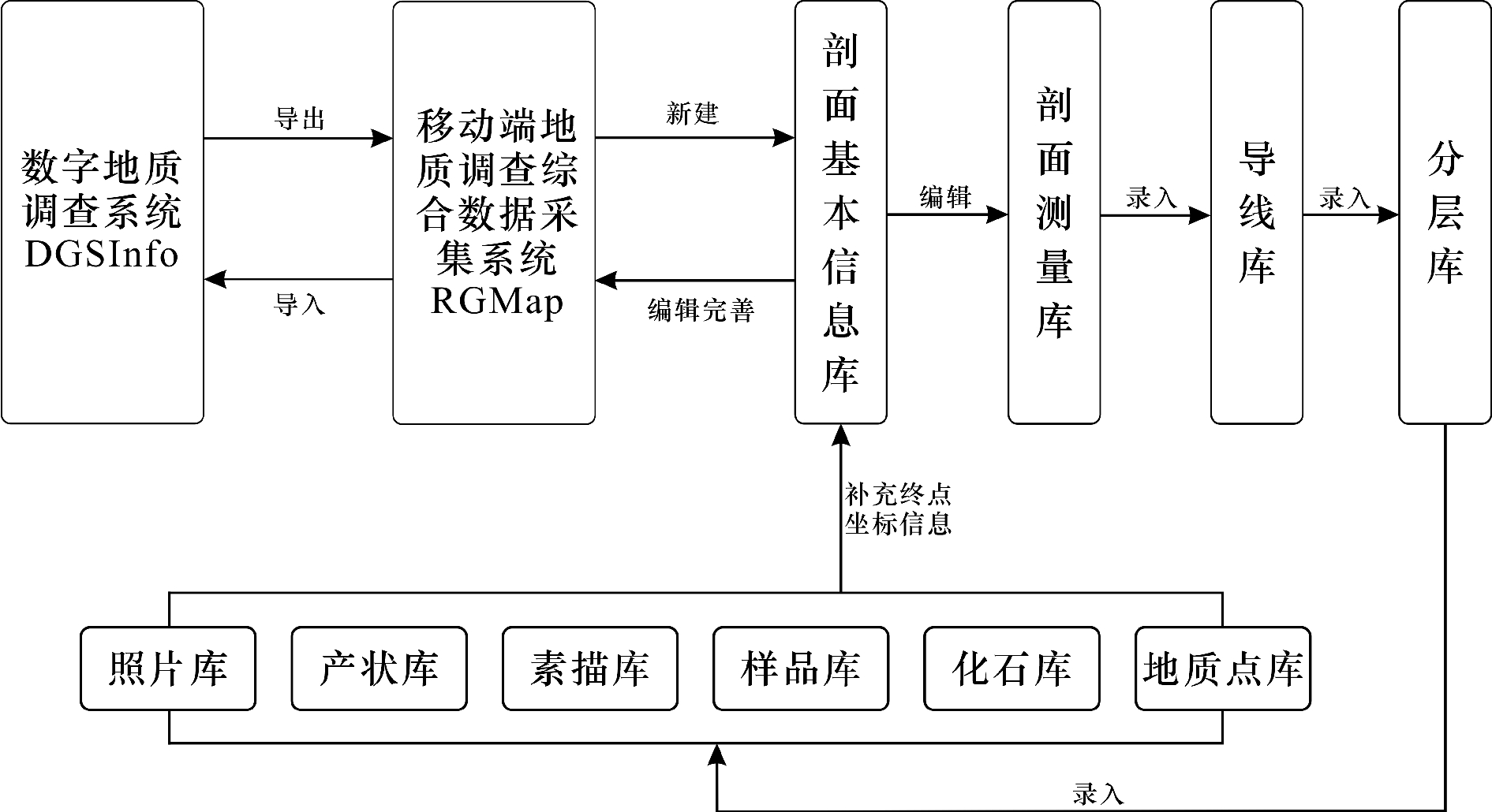 数字填图系统(RGMAP)的基础在于数据库的建立,所有过程和逻辑关系都与数据库息息相关。系统包含剖面基本信息库和剖面测量库,剖面测量库包含导线、分层、照片、产状、素描、样品、化石和地质点数据库等信息,其中,导线数据库是实测剖面的基础,后续分层、照片、产状等数据均与导线库存在必然的逻辑关系,当野外数据采集完成后,修改完善剖面基本信息库再导入PC端,使整个数字化流程形成一个闭环(图1)。