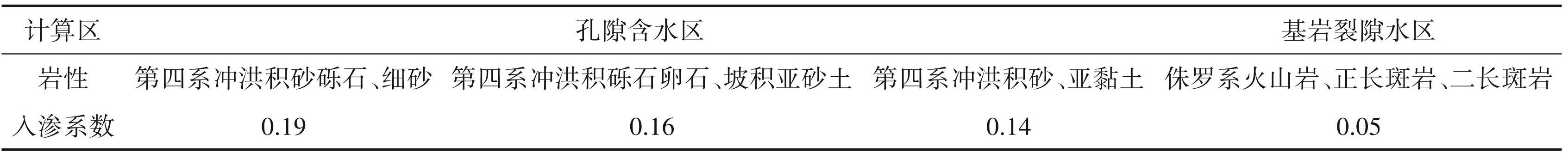 本次地下水资源评价中涉及到的水文地质参数主要有降水量 P、大气降水入渗系数 α 等。降水量P采用多年平均值436.9 mm/a。大气降水入渗系数α参照《区域水文地质普查报告(冀北地区)》中各分区的经验值,具体数值见表4。