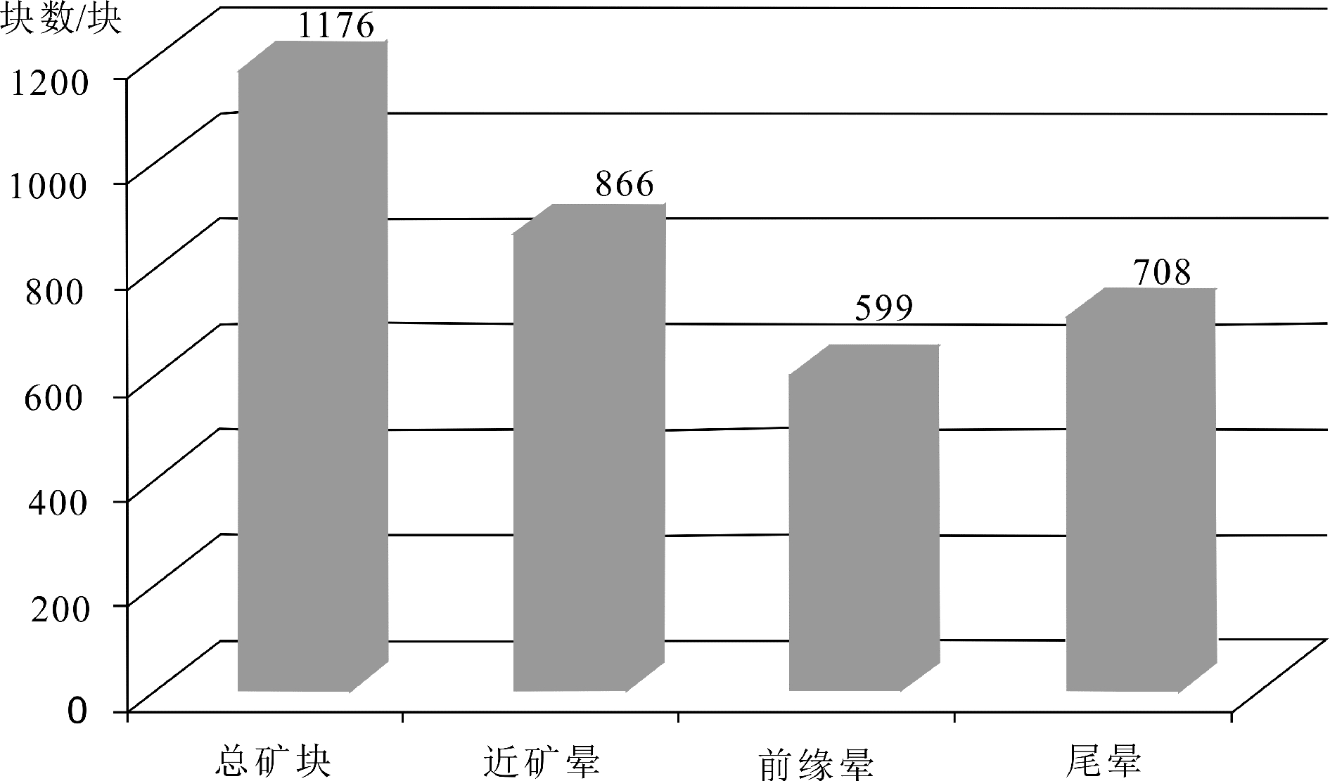 在立方体模型中根据元素组合异常进行赋值,取夹在异常值区间内的部分作为地球化学的异常信息进行提取,然后建立钻孔原生晕块体模型。经统计近矿晕元素为 866块,前缘晕元素 599块,尾晕元素708块(图6)。