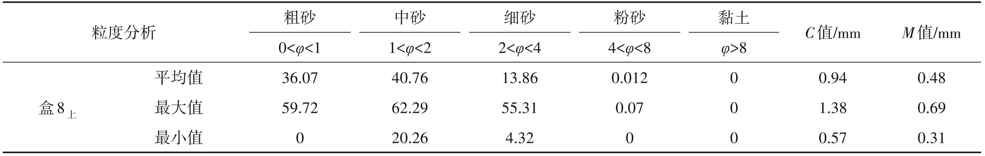 粒度分析及薄片鉴定结果表明,砂岩主要有含砾粗砂岩、粗砂岩、中砂岩、细砂岩。统计计算得出盒 8 上亚段 C 值为 0.57~1.38 mm,M 值为 0.31~0.69 mm,粒度标准偏差为 0.53~1.76,尖度为 1.16~3.41(表2)。