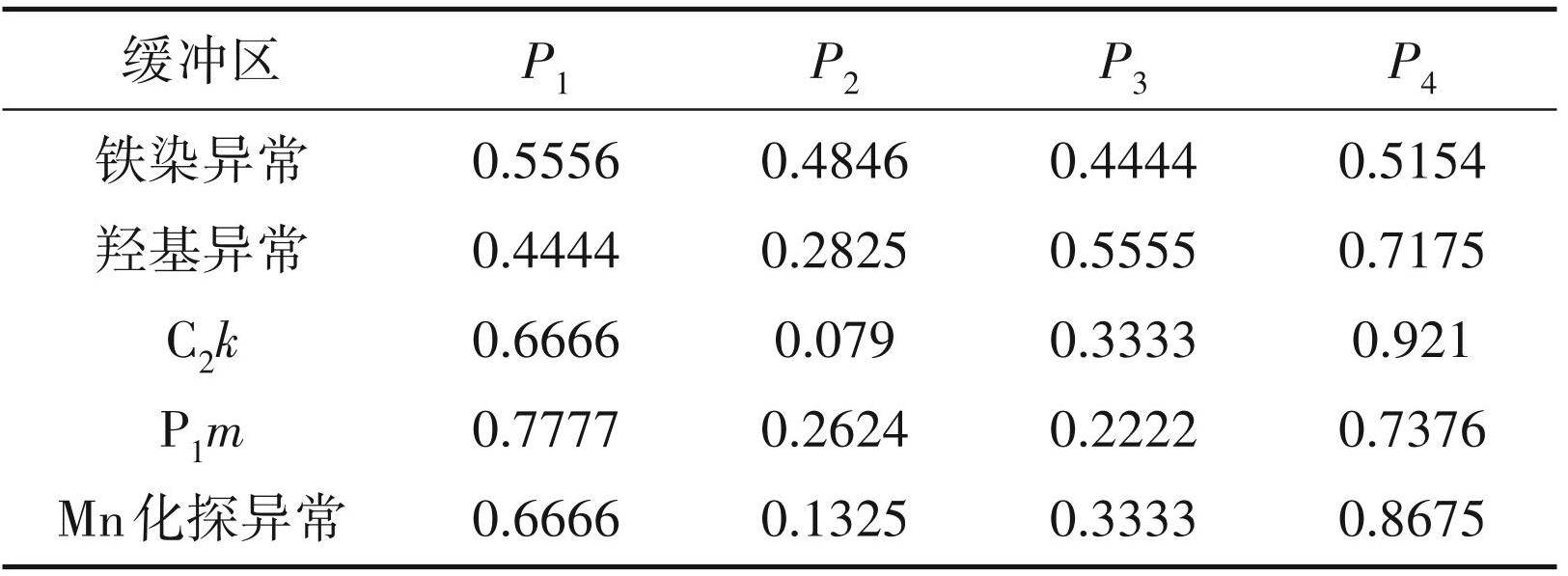 上石炭统喀拉阿特河组与下二叠统玛尔坎雀库塞山组为锰矿床的赋矿地层,作为直接的找矿标志,确定为预测变量。锰元素化探异常是找锰的最理想手段,可作为找矿标志,作为预测变量。通过证据权重法取得在对地层及锰元素化探异常的先验概率,这两个变量 P1与 P4值较为理想,表现为与成矿有较好的关联性,可作为证据因子。