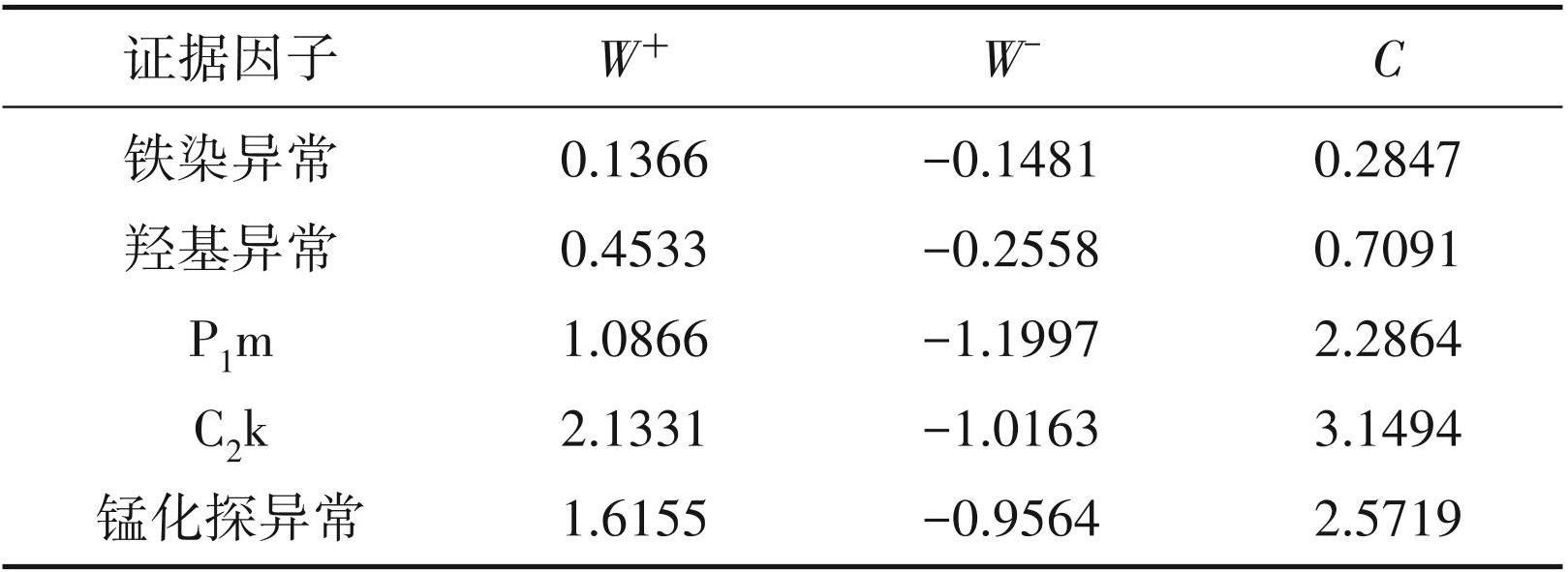 C>0表征证据因子与成矿正相关,C<0表征证据因子与成矿负相关。正值越大表征越有利于成矿(孔旭等,2016)。