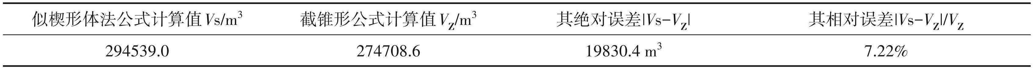 对前述两方法对实例计算的结果,如对用似楔形体公式法计算体积结果用Vs表示,用截锥形体积公式计算体积结果仍用 Vz表示,则其两体积结果值的对比结果可见表1。从表1中可知,其后者的结果值绝对误差为19830.4 m3,其相对误差达7.22%。