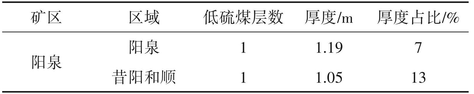 全省薄层低硫无烟煤仅存在于阳泉矿区阳泉和昔阳和顺区块。其中,阳泉区块薄层低硫无烟煤厚度占比为 7%,昔阳和顺区块薄层低硫无烟煤厚度占比为 13%,则矿区薄层低硫无烟煤的平均厚度占比为10%(表6)。全省薄层低硫无烟煤的保有资源量占比为:阳泉矿区无烟煤保有资源量的全省占比×阳泉矿区薄层低硫无烟煤的厚度占比,即 28%× 10%=2.8%≈3%。