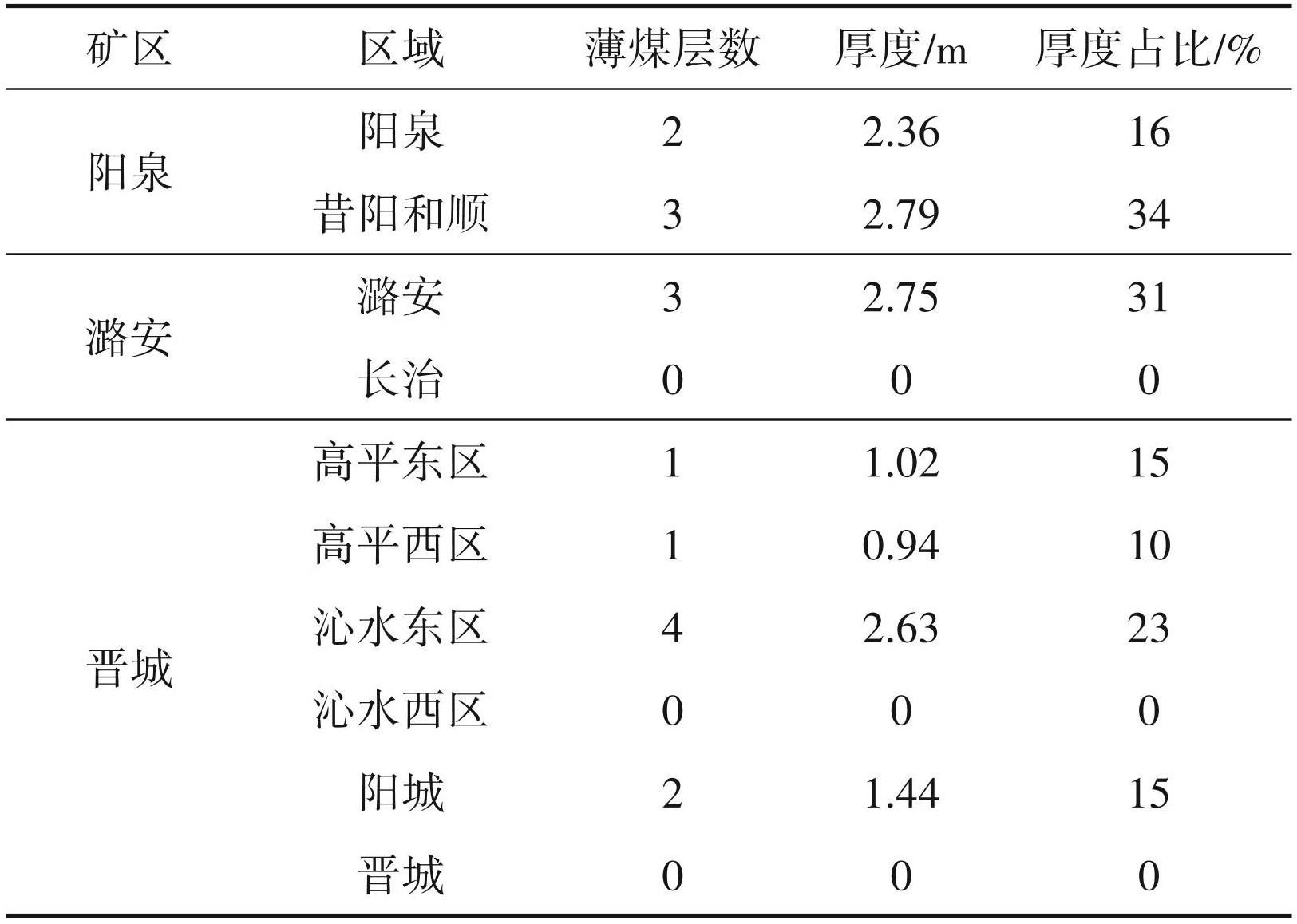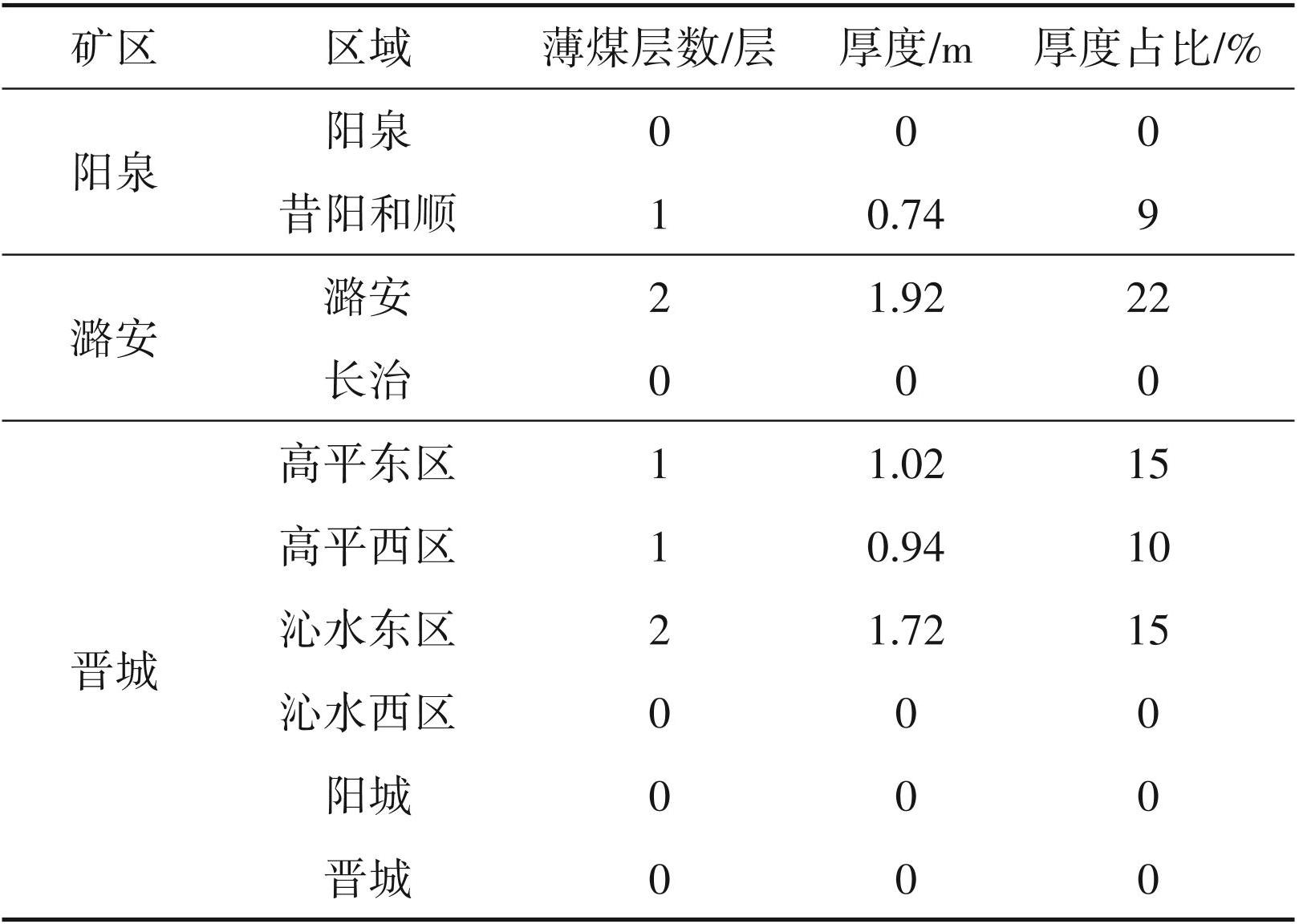 按照煤矿安全规程,薄煤层是指井工煤层小于 1.3 m 的煤层(国家安全生产监督管理总局和国家煤矿安全监察局,2016)。根据已有的勘查成果(刘汉斌和郭建云,2021),整理山西无烟煤中薄煤层数据(表5)发现,薄层无烟煤在山西三大无烟煤矿区均有分布,薄煤层数 1~4 层,薄煤层累计厚 0.94~2.79 m,厚度比 10%~34%。其中,阳泉矿区薄煤层厚度比为25%,潞安矿区16%,晋城矿区10%。不同区块薄层无烟煤厚度为 0~2.79 m,平均厚 1.39 m,厚度比为 0~34%,平均 14%。用矿区薄层无烟煤厚度占比近似代替矿区薄层无烟煤的储量占比,则全省薄层无烟煤的保有资源量占比为:∑矿区全省保有无烟煤资源量占比×矿区薄层无烟煤厚度占比,即28%×25%+6.1%×16%+52.9%×10%=13%。