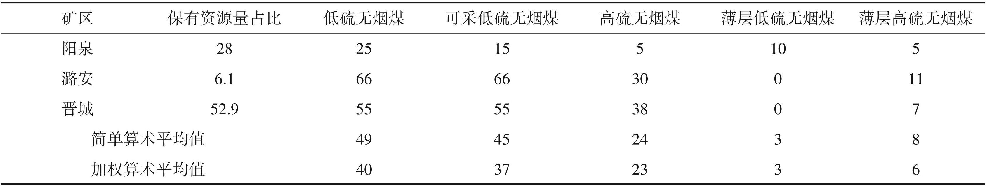根据王学军等(2015)的研究成果和《稀缺、特殊煤炭资源的划分与利用(GB/T26128-2010)》,本文将山西无烟煤划分为低硫无烟煤(S<1%)、高硫无烟煤(S>3%)、薄层无烟煤(煤层厚度H<1.3 m)、低硫薄层无烟煤(S<1%,H<1.3 m)、高硫薄层无烟煤(S>3%,H<1.3 m)并分别进行了讨论和计算。考虑数据的不完备性,本文使用矿区该类煤层的厚度占比近似代替该类煤层的储量占比。文中各个矿区煤质和煤层数据来自于山西省煤炭资源图集(山西省煤炭资源图集编辑委员会,2008①)。