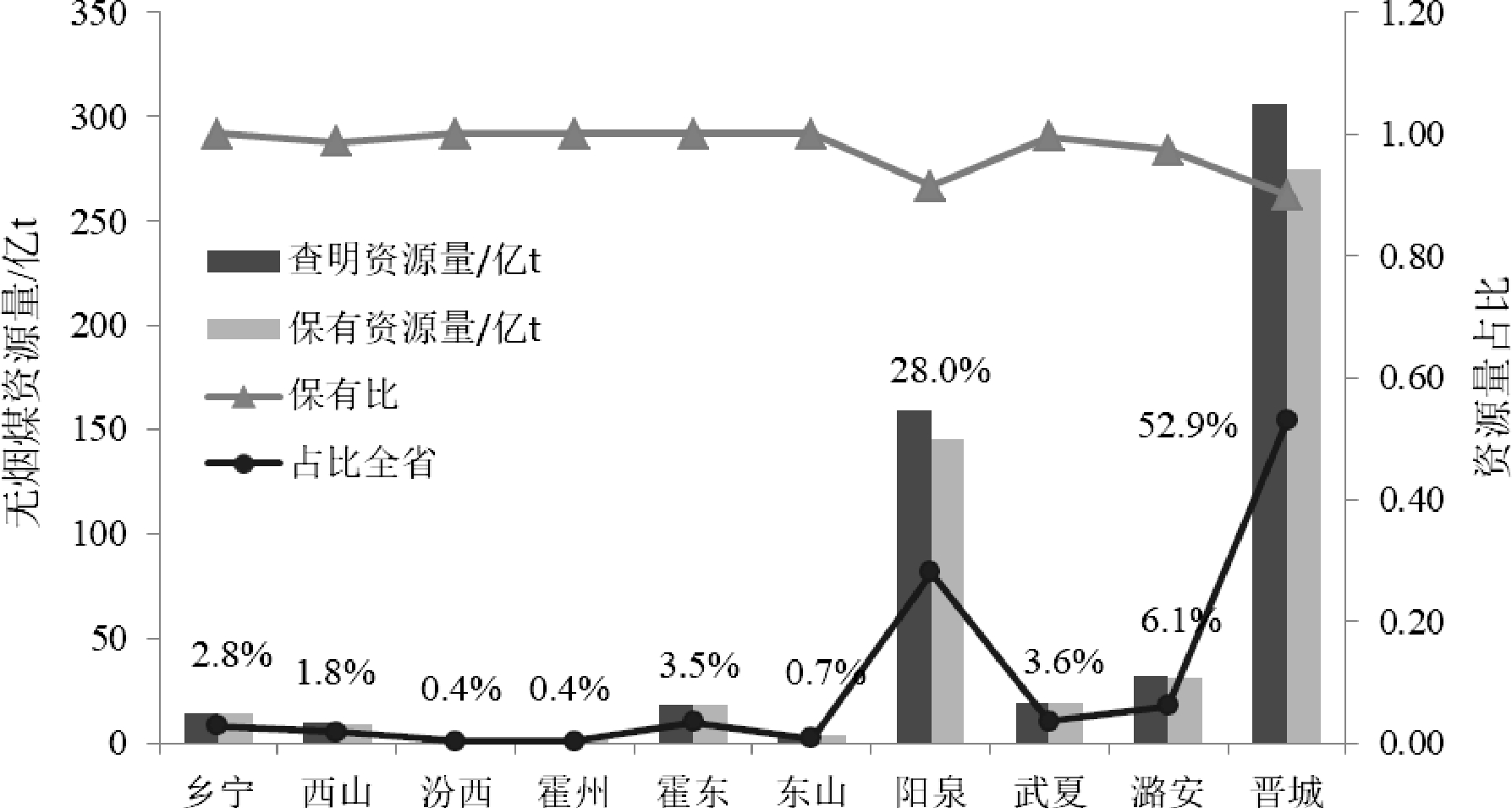 图1 山西无烟煤保有资源量的矿区分布