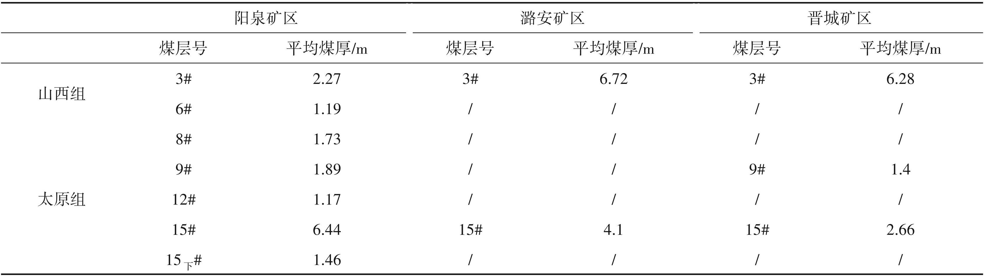 根据已有的勘查成果(山西省煤炭地质局, 2014),沁水煤田含煤地层为石炭纪—二叠纪山西组和太原组,共含煤层 17 层。其中山西组 4 层,从上到下依次编号为 1~4#煤。太原组含 13 层,编号 5~15#以及 15 下和 16#煤。山西无烟煤的主产区为晋城、阳泉、潞安矿区,均位于沁水煤田东翼,是晋东煤炭生产基地的主要煤炭产区。根据沉积环境, 3个矿区主要可采煤层为山西组的3#煤和太原组的 15#煤。其中 3#煤位于山西组下部,在沁水煤田分布广泛,阳泉地区平均厚 2.27 m 左右,晋城和潞安矿区沉积较厚,平均 6.50 m 左右。15#煤位于太原组下部,是沁水煤田下组煤的主要可采煤层,阳泉矿区一般厚6.44 m左右,潞安、晋城矿区分叉变薄,平均可采厚度3.38 m左右(表2)。