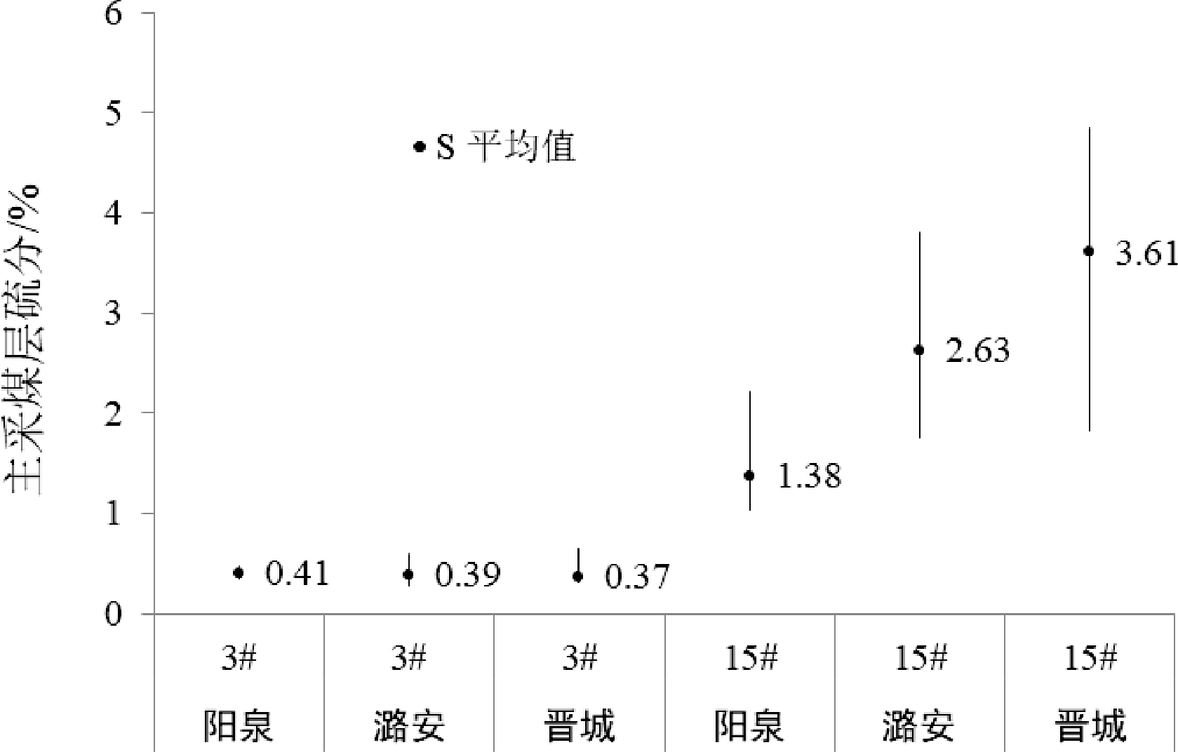 山西阳泉、潞安、晋城矿区山西组 3#煤的硫分为 0.27%~0.64%,平均 0.39%;15# 煤的硫分为 1. 03%~4.84%,平均 2.54%,平均硫分含量是 3#煤平均值的 6.5 倍。其中阳泉矿区 15#煤的硫含量为 1. 03%~2.21%,平均1.38%;潞安矿区15#煤的硫含量为1.76%~3.81%,平均2.63%;晋城矿区15#煤的硫分含量为1.83%~4.84%,平均3.61%(图3)。