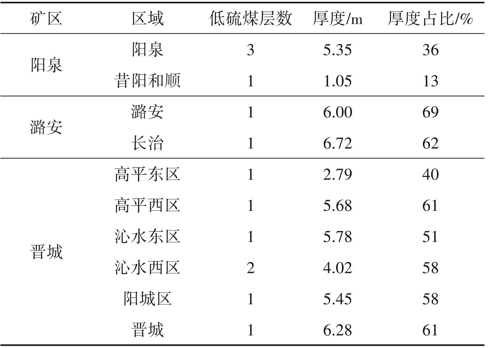 低硫无烟煤在 3 个矿区广泛分布,阳泉区块低硫无烟煤层数最多,其次为沁水西区。长治区块低硫无烟煤最厚,为 6.72 m。厚度占比方面,潞安区块低硫无烟煤厚度比最大,为 69%。昔阳和顺区块低硫无烟煤占比最小,为 13%。阳泉、潞安、晋城矿区低硫煤厚度比分别为 25%、66%、55%(表3)。全省低硫无烟煤厚度为1. 05~6.72 m,平均厚4.90 m,厚度比为13%~69%,平均51%。全省低硫无烟煤的保有资源量占比为:∑矿区全省保有无烟煤资源量占比 × 矿区低硫无烟煤厚度占比,即 28%×25% +6.1%×66%+52.9%×55%=40%。