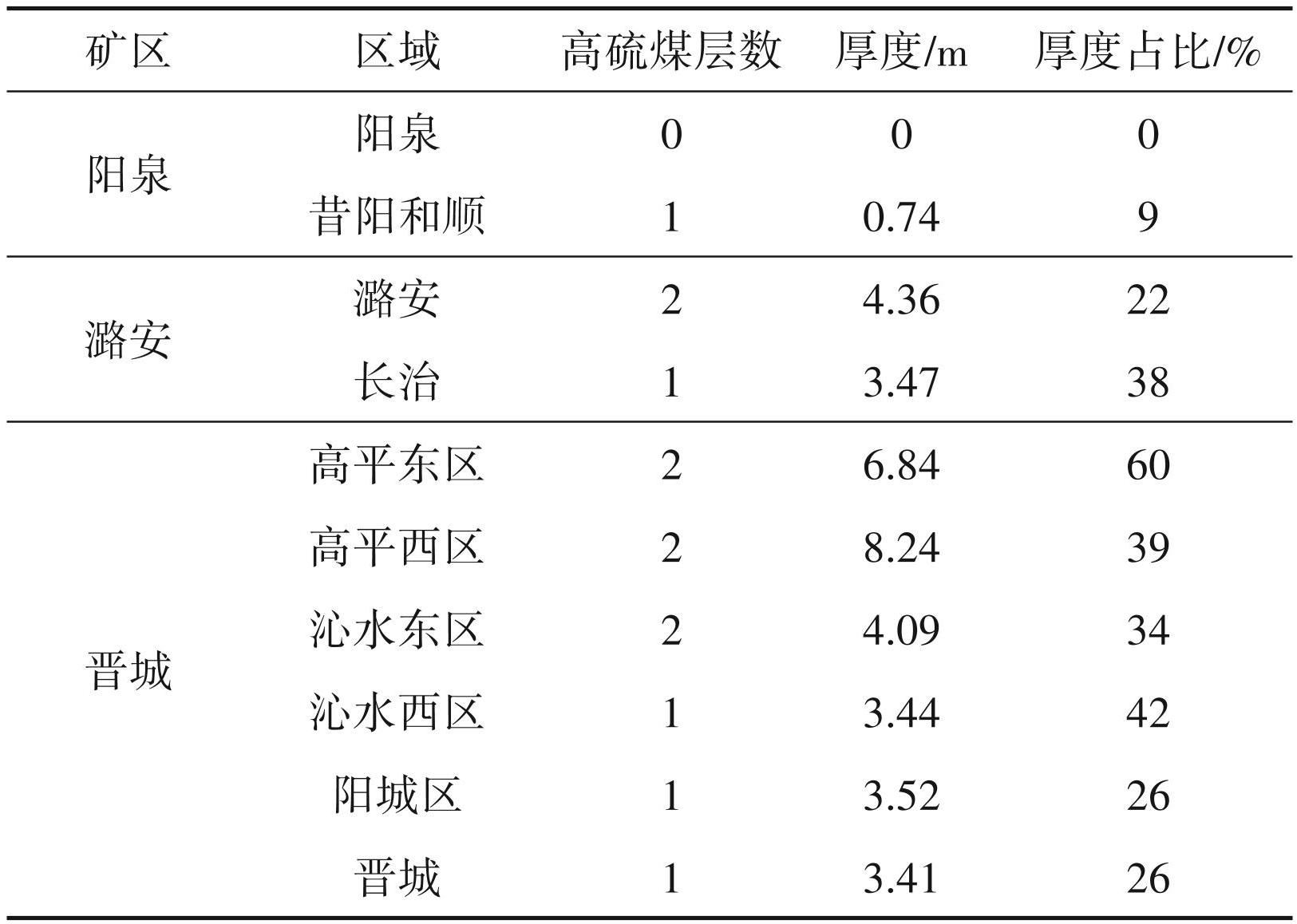 按照煤炭质量分级(GBT15224.2-2010),整理阳泉、潞安、晋城矿区不同区块高硫无烟煤厚度数据(表4)。据表所示,阳泉矿区昔阳和顺区块赋存高硫煤 1 层,高硫煤层厚度占区块煤层总厚度的 9%。潞安矿区潞安区块赋存高硫煤2层,长治区块赋存高硫煤 1 层,分别占无烟煤层总厚的 22% 和 38%。晋城矿区高平区块、沁水东区分布高硫煤 2 层,沁水西区、阳城区、晋城区拥有高硫煤1层,厚度占煤层总厚的 42%、26%。阳泉、潞安、晋城矿区高硫无烟煤厚度占比分别为5%、30%、38%(表4)。不同区块高硫无烟煤厚度为 0~8.24 m,平均 3.81 m,厚度比为 0%~60%,平均 30%。全省高硫无烟煤的保有资源量占比为:∑矿区全省保有无烟煤资源量占比×矿区高低硫无烟煤厚度占比,即 28%×5% +6.1%×30%+52.9%×38%=23%。