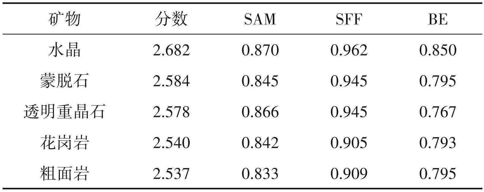具体比对结果如下:(1)石英脉:用户地物波谱库正确识别为水晶(得分2.682),JPL库误判为石膏 (得分 2.512)。(2)二长花岗岩:用户地物波谱库准确识别为花岗岩(得分2.517),JPL库识别为相近岩类石英砾岩(得分 2.359)。(3)黑云二长花岗岩:用户地物波谱库识别正确为黑云母花岗岩(得分 2.793),JPL 库识别为相近岩类黑云母斑岩(得分 2.598)。(4)黑云母花岗岩:用户地物波谱库识别为相近岩类斑状二长岩(得分 2.764),黑云母花岗岩 (得分 2.642);JPL 库识别为相近岩类花岗闪长岩 (得分 2.558)。(5)粗粒花岗岩:用户地物波谱库准确识别为碱长石花岗岩(得分2.843),JPL库误判为石灰华(得分 2.722),得分第二的石英砾岩为相近岩类(得分 2.716)。(6)中粒花岗岩:用户地物波谱库识别为主要矿物斜长石(得分2.793),JPL库误判为杏仁状玄武岩石(得分 2.788)。(7)细粒花岗岩:用户地物波谱库准确识别为钾长石花岗岩(得分 2.865),JPL库误判为红砂岩(得分2.770)。(8)闪长岩:用户地物波谱库识别为类似矿物阳起石(得分 2.856),JPL 库误判为海绿石砂岩(得分 2.709),得分第二的角闪石片岩为相近岩类(得分2.688)。研究区位于动力变质蚀变带内,岩矿均有一定程度的蚀变,以致在比对标准波谱库时评分较低,除此之外,数据采集时硬件的差异也是原因之一。以上研究进一步证实了用户地物波谱库在数据来源和针对性方面更优于现有标准波谱库,用户地物波谱库针对性更强,更适用于特定研究区域和地物类型,同时具有实时性,能实时更新以反映研究区域的实际情况与更多地考虑实际环境因素。在实际应用中,应结合用户波谱库和标准波谱库的优点,以提高高光谱匹配识别的准确性和有效性。