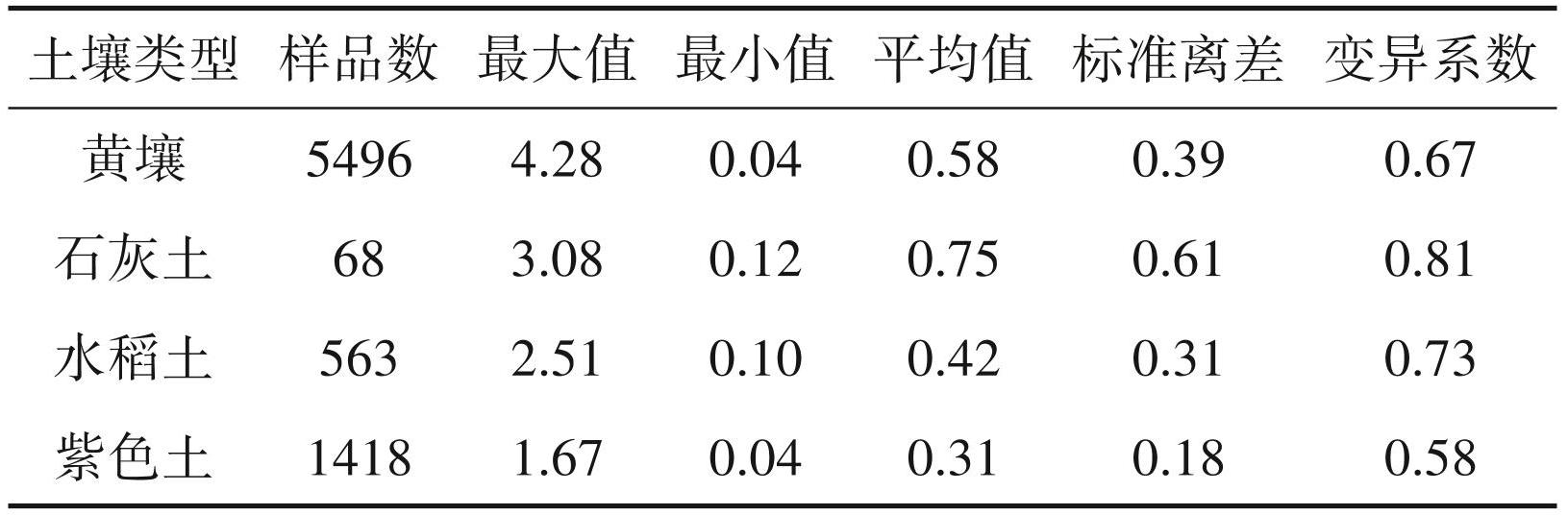 不同类型的土壤硒含量也存在较大的差异(李丕鹏等,2020)。习水县主要土壤类型主要有黄壤、水稻土、石灰土、紫色土、粗骨土。因粗骨土在本次采样中数据较少,不具有代表性,故此剔除。通过对表层耕地各土壤类型采样分析测试数据统计(表4),获得了习水县不同的土壤类型中表层耕地土壤硒含量:石灰土最高,平均含量为 0.75 mg/kg,其次为黄壤,平均含量为0.58 mg/kg,水稻土平均含量为 0.42 mg/kg,紫色土最低,平均含量为 0.31 mg/kg。耕地土壤类型对硒含量表现为:石灰土>黄壤>水稻土>紫色土,不同的土壤类型对硒含量有较大的影响。