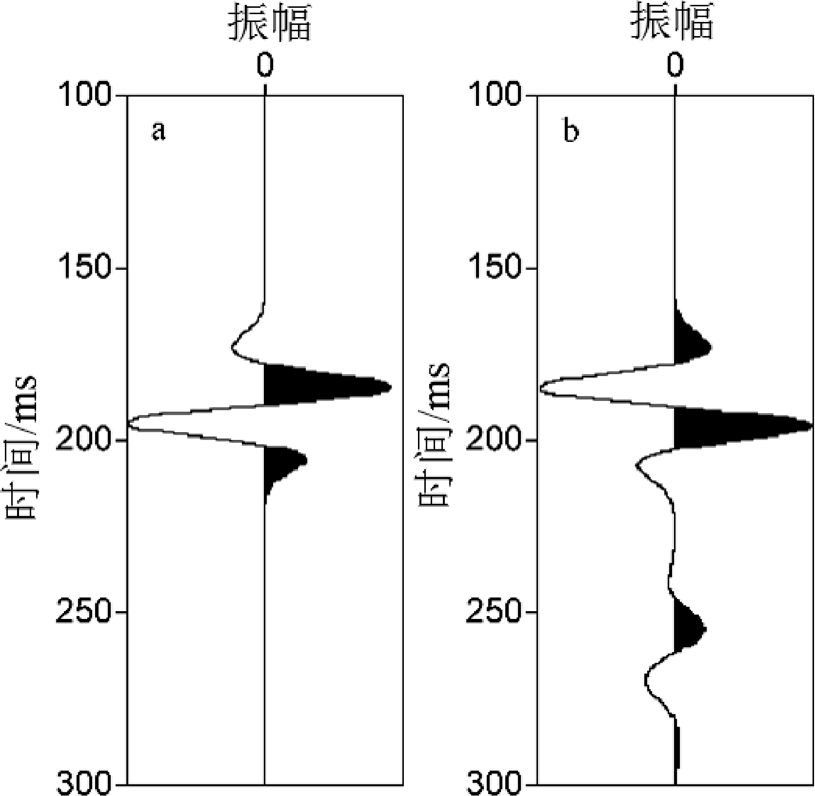 为客观模拟岩浆岩在实际地震剖面上的反射特征,首先利用波动方程数值模拟方法对岩浆岩模型的叠前波场进行模拟,再对叠前波场进行偏移成像。正演模型设计如图2 所示(红色为岩浆岩),岩相类型包括岩床和沿墙。模拟单炮记录反映了来自浅、深两个区域的岩浆岩反射波,其中第一层岩浆岩厚度较小,反射波能量较弱,深部岩浆岩厚度较大,反射波能量较强,对于岩浆岩内部,反映出较为复杂的反射和绕射波场。图3a 为叠前时间偏移处理获得的岩浆岩反射波特征,火山口顶部的形态与地质模型较为接近,绕射波得到较好地收敛,地震剖面上岩浆岩的反射波与岩浆岩结构之间具有明确的对应关系,但岩浆岩内部构造得不到准确的反映。图3b 为叠前深度偏移处理获得的反射剖面特征,此时剩余绕射能量得到充分的收敛,地震剖面清晰地反映了岩浆岩的构造特征,岩浆岩内部构造也得到精确地成像,可以直接利用反射波同相轴的空间展布和几何关系可对岩浆岩分布进行准确描述。由此可见,岩浆岩结构和波场复杂,不同的处理方法获得的岩浆岩反射波特征差异较大,因此,高精度的处理成果是岩浆岩反射波特征正确识别的基础。
