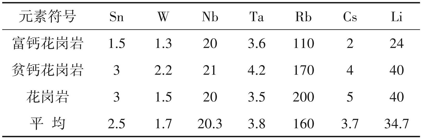 注:相应矿种边界品位的下限值为:Sn 1000×10-6、WO3 640×10-6、Nb2O5 150×10-6、Ta2O5 80×10-6、Rb2O 400×10-6、Cs2O 250×10-6、Li2O 5 000×10-6。