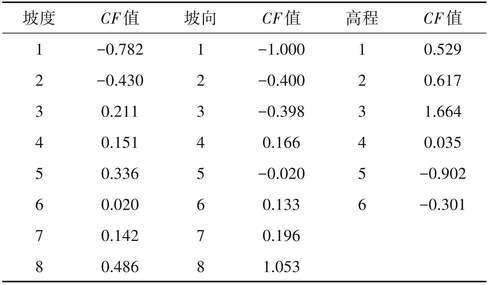 根据坡度、坡向和高程的划分,统计每个区间中的评价单元个数。通过确定性系数法对区间进行分级量化,利用确定性系数(certaintyfactor,CF)得出结果见表6。
