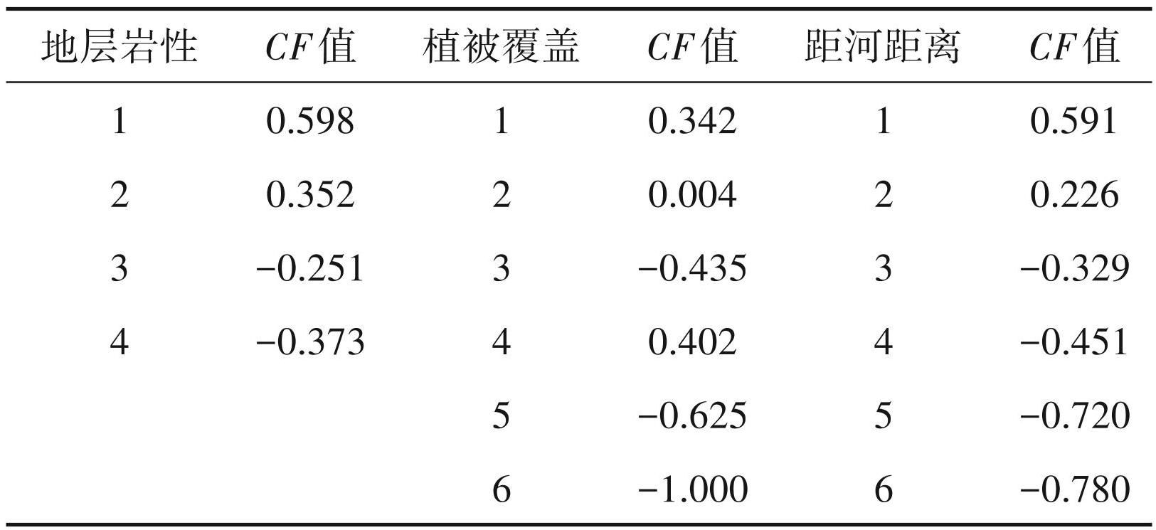 根据地层岩性、植被覆盖和距河距离的划分,统计每个区间中的评价单元个数,利用确定性系数法对区间进行分级量化,结果见表7。