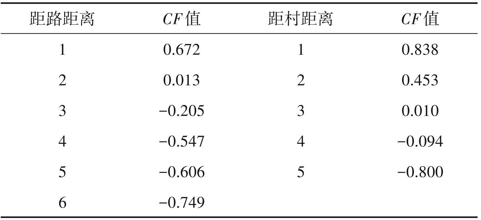 根据距路距离和距村距离的划分,统计每个区间中的评价单元个数,利用确定性系数法对区间进行分级量化,结果见表8。