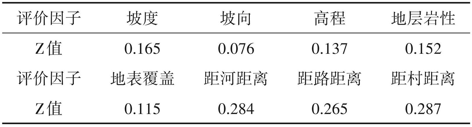 在得到各因子 Z 值之后要对其进行计算贡献值,然后利用归一化公式计算影响因子的权重,计算公式为: