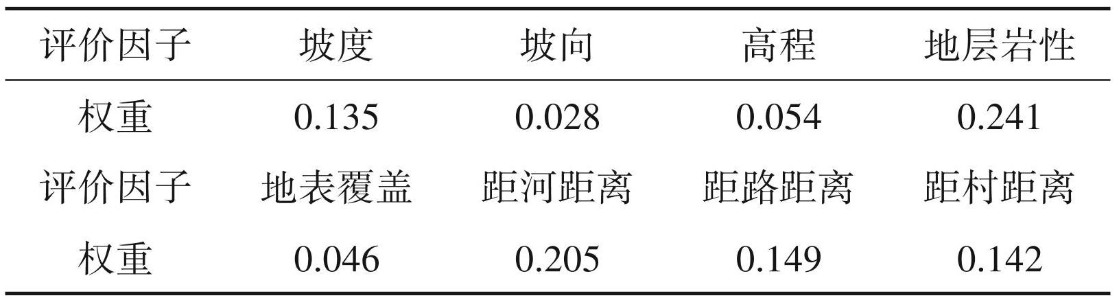 本研究选取坡度、坡向、高程、地层岩性、植被覆盖、距河距离、距路距离、距村距离 8 个指标因子作为研究区滑坡灾害评价因子,将评价因子分为地貌因子、环境因子、人类活动因子,分别进行计算分析。