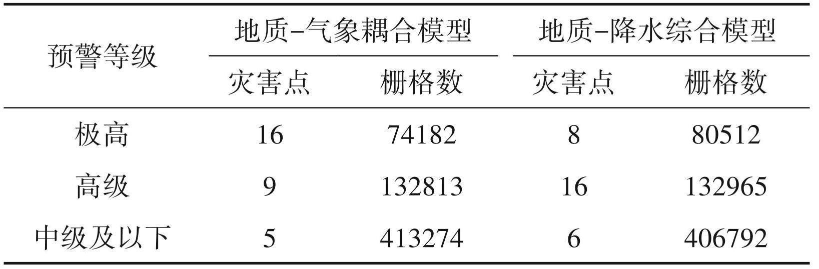 (1)地质-气象耦合模型在极高、高级、中级及以下的预警等级下的灾害点数分别为16、9、5,栅格数分别为74182、132813、413274;