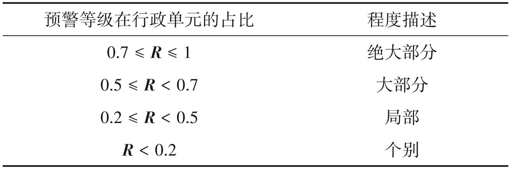 将R作为判别指标对预警等级的广泛程度进行描述,分别为绝大部分、大部分、局部和个别 4 个等级,定义见表1。