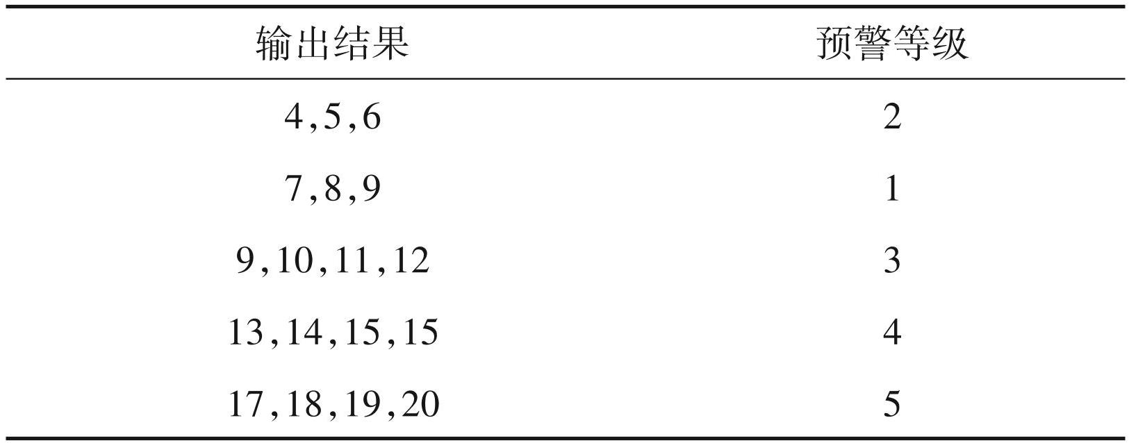 利用公式(3)将4个因子代入进行计算,共运算 4次,预警结果的数值区间是[ 4,20],根据预警等级对预警结果进行划分,分别得到各个数值的对应预警阈值(表4)。