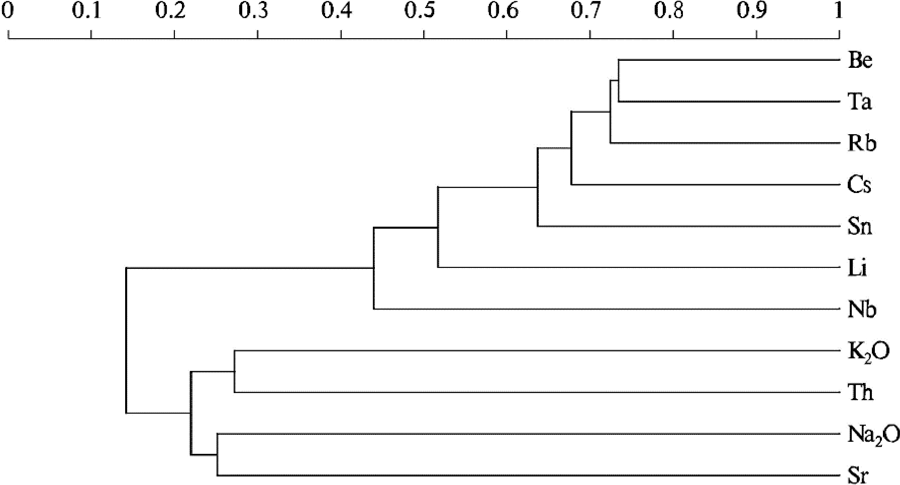 通过矩阵表2和初始因子载荷矩阵表3,可以发现,Li 与 Be、Nb、Ta、Rb、Cs、Sn 均呈正相关关系,与 Th呈负相关关系,与 K、Na、Sr相关性较差。通过图2 可以看出,在系数 r>0.4 时,可以将 11 元素分成 2 类:Li、Be、Nb、Ta、Rb、Cs、Sn 这 7 元素为一组,关系密切,有共同富集成矿的可能,反应与伟晶岩有关的元素组合;K2O、Na2O、Sr、Th 这 4 种元素组合为一组,反应与沉积变质砂板岩有关的元素组合。