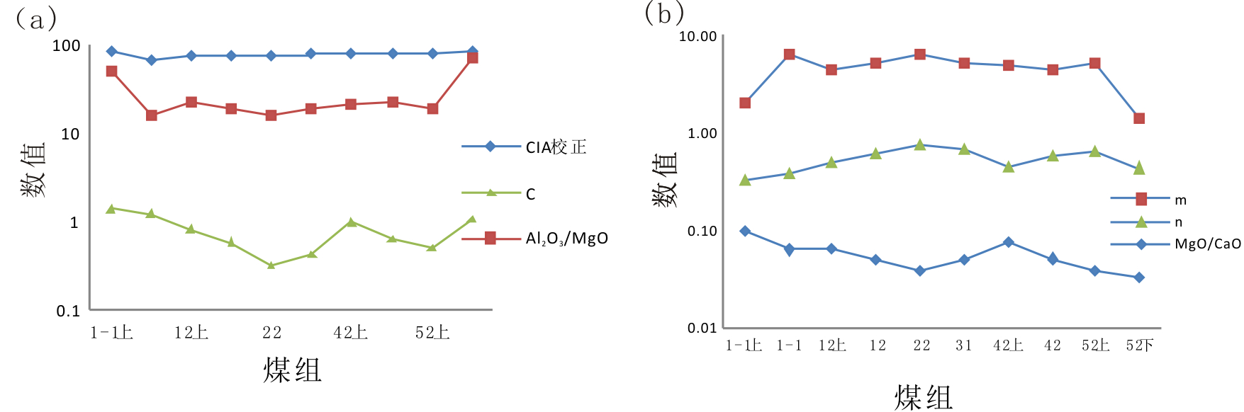 研究区煤样 Al2O3/MgO 值为 15.61~72.8,平均 27.87,煤样 Al2O3/MgO 比值较高,且变化范围大,反映延安期为温暖潮湿、降雨多的气候环境,在温暖潮湿的气候条件下,有利于植物的生长繁盛,为后来煤炭形成创造了有利条件。