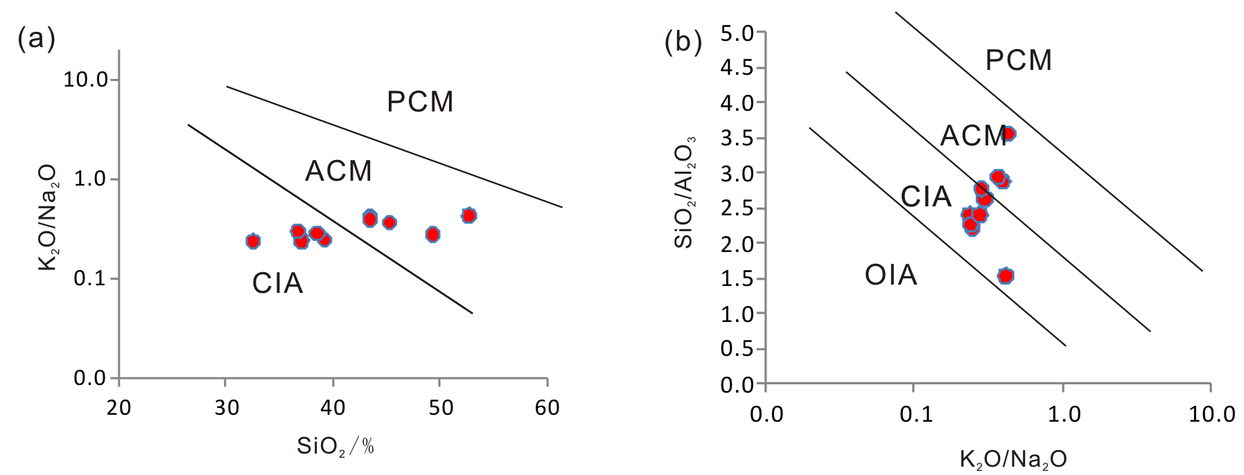 大地构造作用是控制地质和沉积作用的关键因素,它控制着物源区的上升和剥蚀、拗陷区沉积物的搬运、堆积等,进而影响沉积建造(沉积物的性质、成分、结构和构造等)特征。不同构造环境形成的岩石包含的元素丰度不同,活动大陆边缘的沉积物中 K2O、SiO2含量明显比活动大陆边缘的沉积物高,Roser、McLennan 等提出利用岩石的 K2O/Na2O-SiO2图和 SiO2/Al2O3-K2O/Na2O 图解判别沉积物源区的构造背景(姚红生等,2022)。研究区煤样 K2O/ Na2O-SiO2图和 SiO2/Al2O3-K2O/Na2O 图解上的投点主要处于活动大陆边缘(PCM)区域内(图5),结果表明,延安组物源区构造背景主要与活动大陆边缘 (PCM)相关,但还与大陆岛弧(CIA)有较多联系。