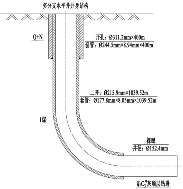 (3)三开近水平段:1039.52 m~终孔,Ø152.4 mm 钻头,裸眼,在目的层或距 1煤底板约 90 m水平钻进至目标靶点终孔。