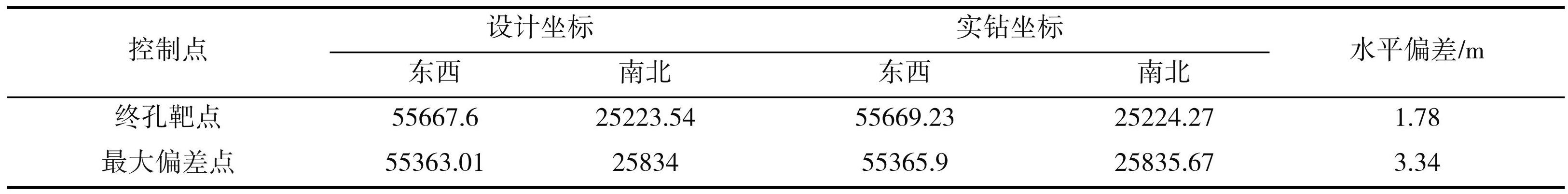 (2)钻井施工过程中,实钻平面轨迹严格按照设计轨迹进行控制,水平段实钻轨迹较设计轨道终孔靶点偏差为 1.78 m,最大偏差为 3.34 m。符合关键落点平面偏差不大于2 m的要求。各关键点实钻与设计平面坐标对比见表3。