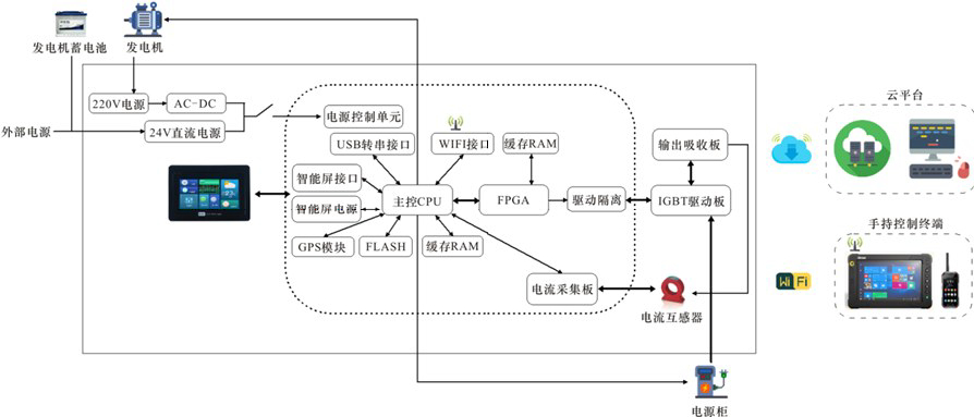 其中,电源系统包括多个小功率AC-DC电源单元。根据需要将所述小功率 AC-DC 电源单元按不同组合方式连接后再连接发电机组。逆变系统包括大功率开关管、驱动单元。大功率开关管根据需要连接成不同形式的多桥电路。控制系统用于配置发射波形,监测系统状态。参数采集系统用于采集发射电流幅值及相位参数。控制系统包括主控 CPU 及辅助电路。智能终端安装有 APP控制软件,用于一体化“集装箱”的控制和状态监测,电流数据显示、存储。云平台为基于智能终端的Web软件系统。系统主要特点包括: