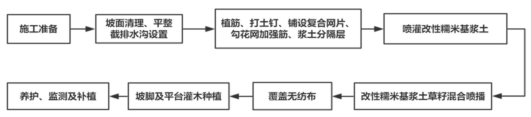 综上所述,与现有的生态修复技术相比,改性糯米基浆土挂网纤维草籽混合喷播技术具有适用范围广、经济和生态效益短期和长期效果均较好等优点。