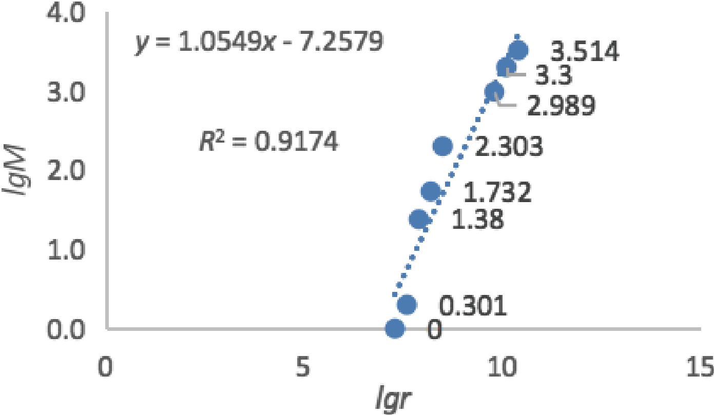 对分维情况进行投图(图5)分析,其斜率即为分维值,由投图结果得出 W 的品位分维值 D= 1.833。从Au、Sb、W的线性回归方程可以看出其相关性 R2均大于 0.9,说明这三者的 lgr 与 lgM 线性关系明显。