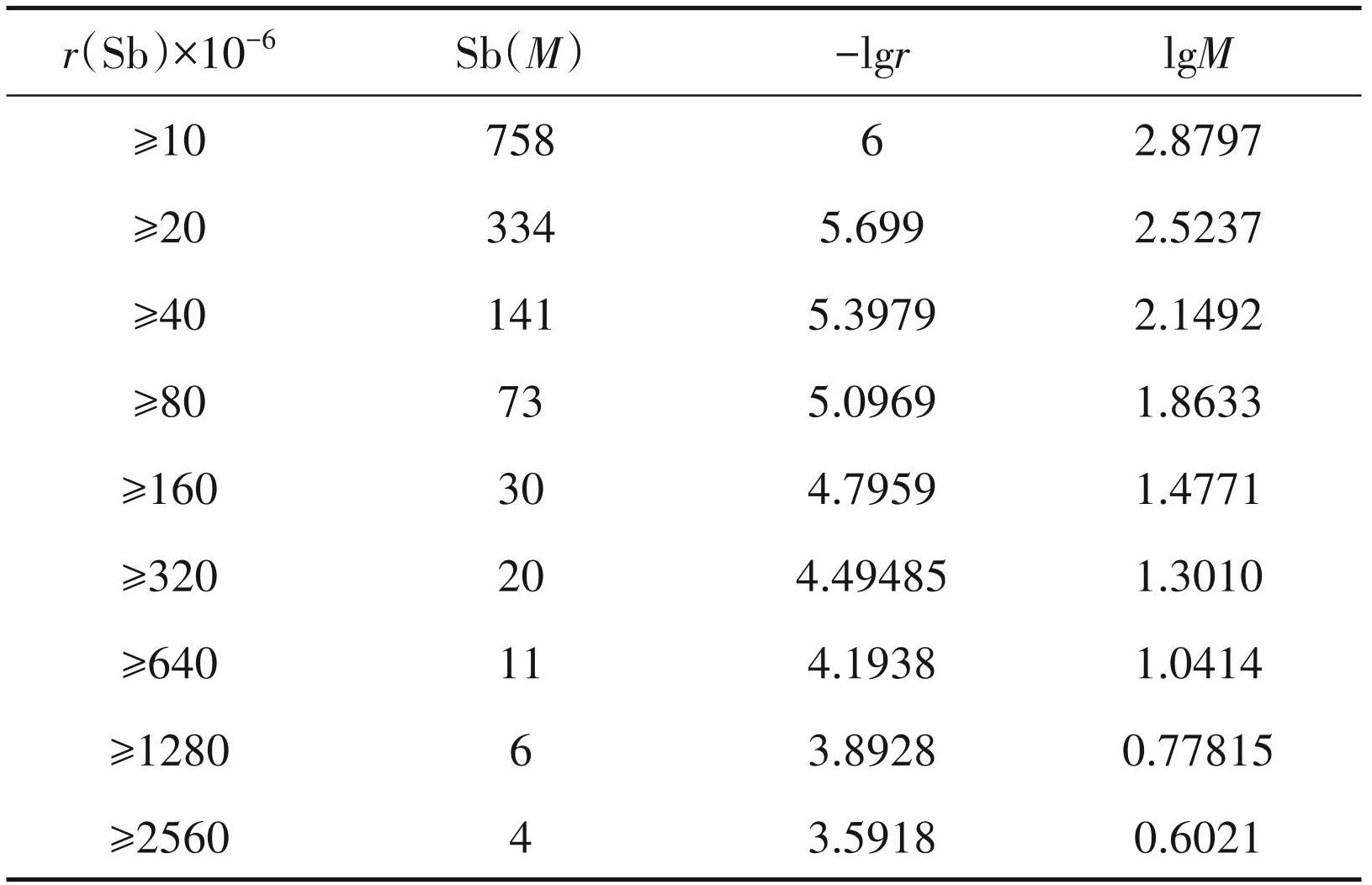 对研究区Sb的品位进行分维研究时,根据区内 Sb 的品位分布特征分别取 r≥(10、20、40、80、160、 320、640、1280、2560)×10-6 时对其品位用盒维法进行统计,结果如下表(表2)所示。