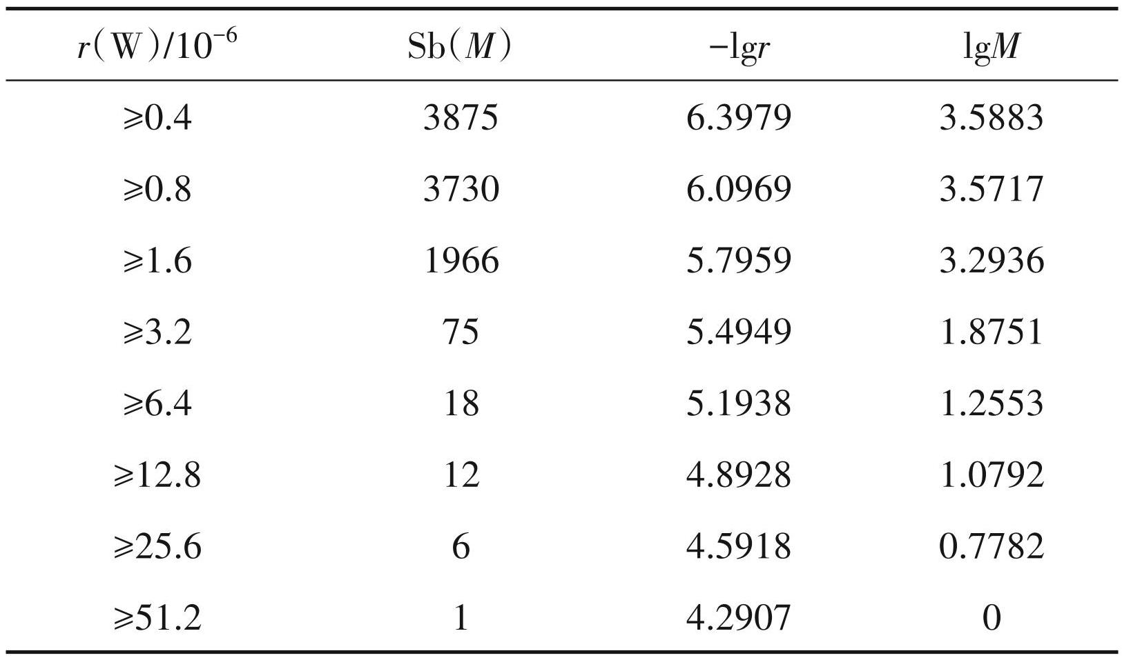 对本区域 W 的品位分布特征进行分维研究时取 r≥(0.4,0.8,1.6,3.2,6.4,12.8,25.6,51.2)× 10-6 时对其品位用盒维法进行统计,结果见下表(表3)。