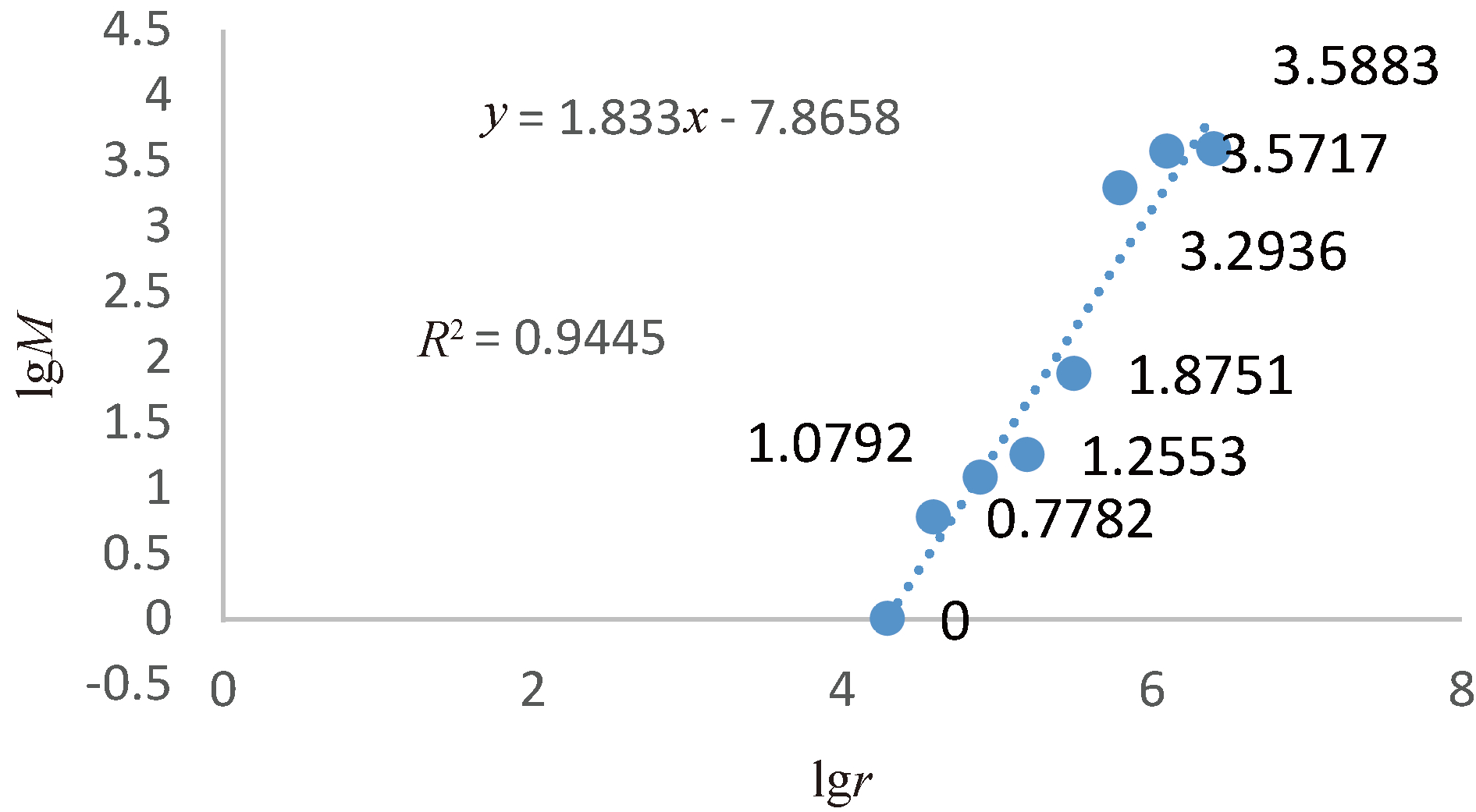 式(1)中,r 为特征尺度;C 为比例常数(C>0); D 为分维值(D>0);M(r)为尺度大于或等于 r 的数目当分维值D前面的符号取负号时,记为M(≥r),或尺度小于等于 r 的数目;当分维值 D 前面的符号取正号时,记为M(≤r)。