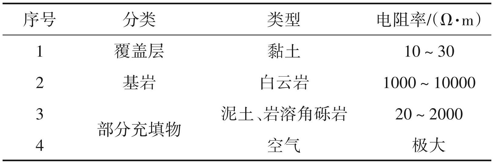 根据已完成的钻孔资料,勘查区涉及到的物质或地层可分成 3 部分。即:上部覆盖层主要为第四系残坡积层(黏土);溶洞充填物主要为空气、泥土、岩溶角砾岩等;溶洞本身所处部位围岩为白云岩 (基岩)(表1)。