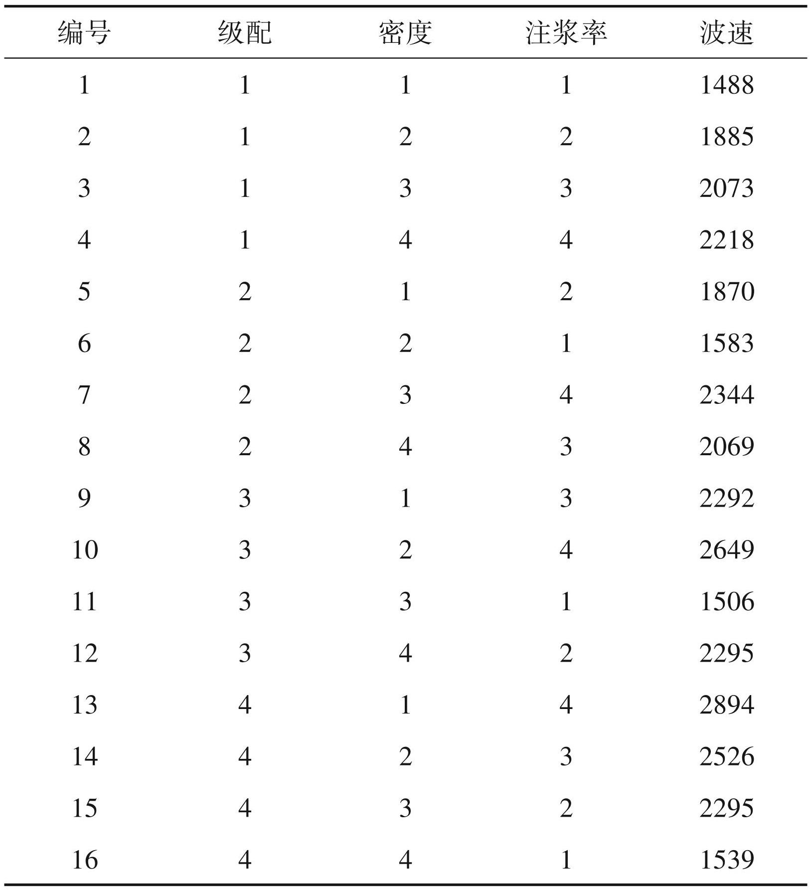 对 P0 32.5 水泥浆按 1∶1 配比,密度按 1.70、 1.80、1.90、2. 00,级配 P5按 0.2、0.4、0.6、0.8,注浆率按 25%、50%、75%、100% 进行,为保证试验的均匀性,采用正交试验中 3因素 4水平进行,测得不同因素下不同水平的波速值如表2所示:
